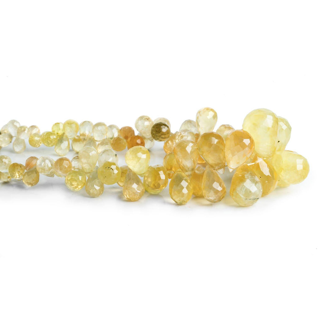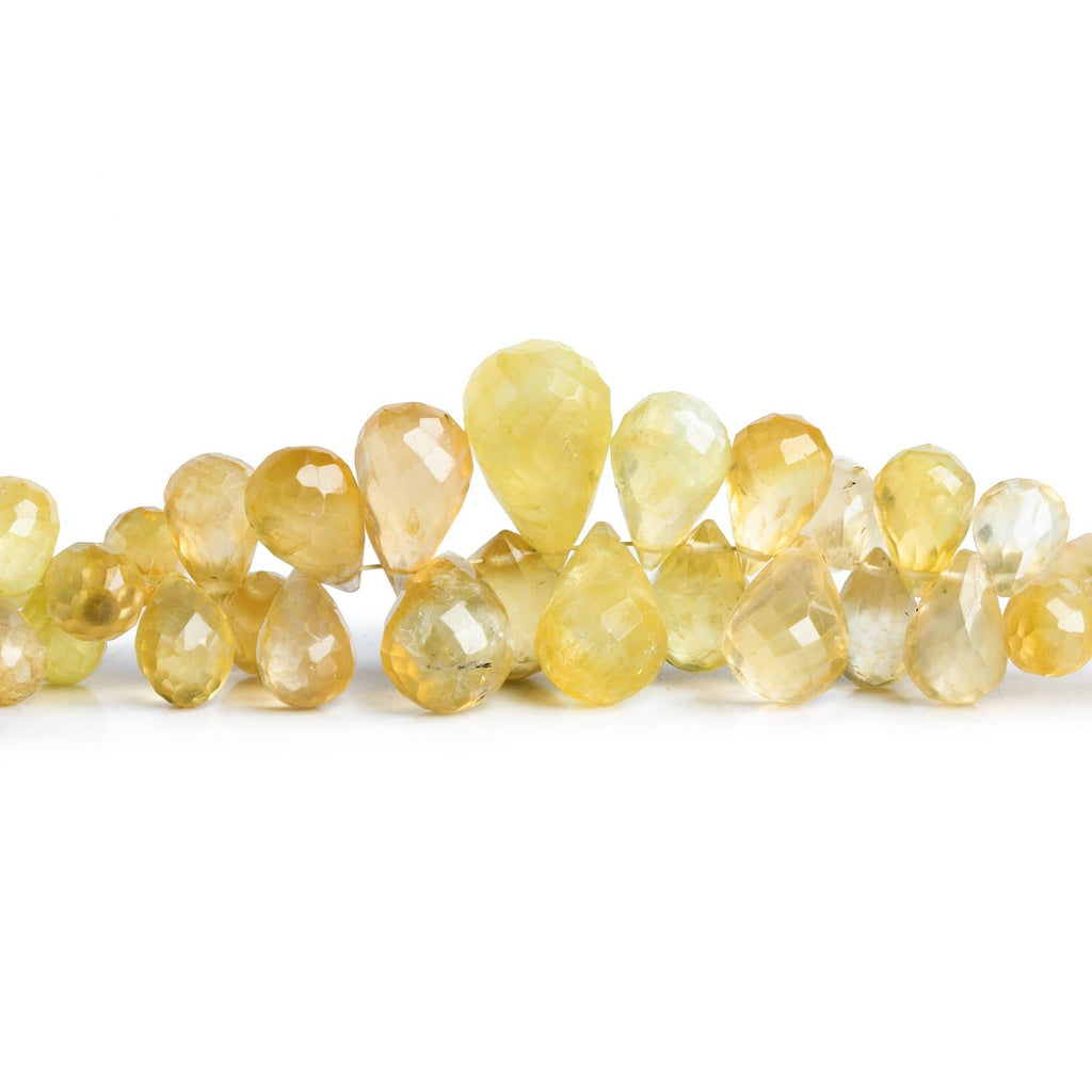 Beads measure about 6x4mm to 15x10mm. This unique strands feature Prehnite beads with a generally yellow color palette. Expect gorgeous faceting across these masterfully faceted teardrop shapes.