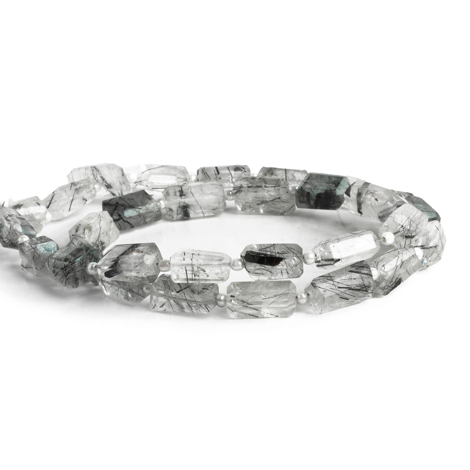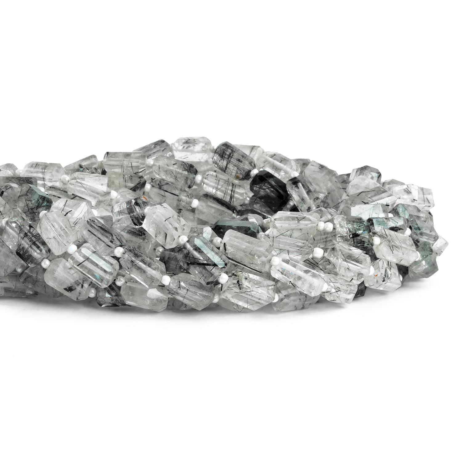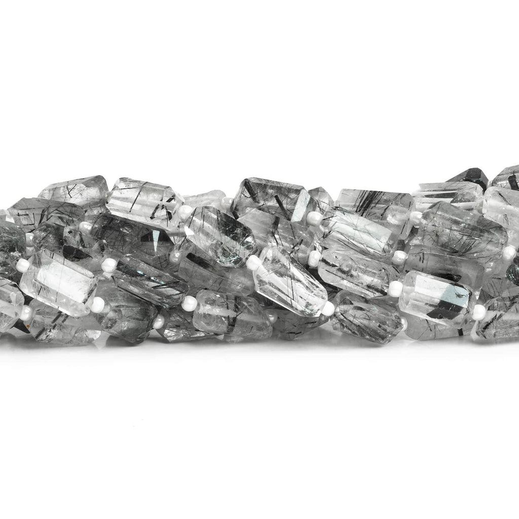Beads measure about 10x5mm to 11x7mm. These beads show off a broad-faced, angular nugget shape that varies in size on the strand. Expect clear bodies filled with the slender needles of Black Tourmaline that give this gemstone its name. Fans of a more regular, clean-crafted shape should jump on these curated strands.