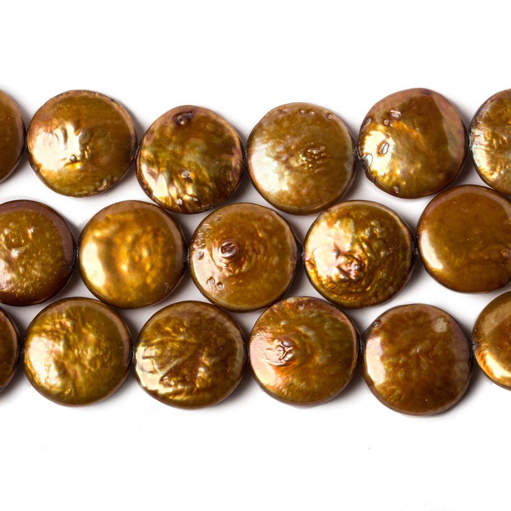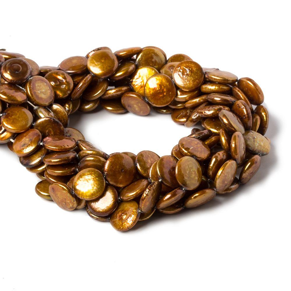 11-12mm in diameter with a color treated body of Amber Brown hue for this Coin Freshwater Pearl strand measuring approximately 16 inches with approximately 34 pieces. We recommend the use of 28 gauge wire, .015 stringing wire, #0 or #1 Silk Poly Cording and Extra Fine Flex Needle with these beads.
