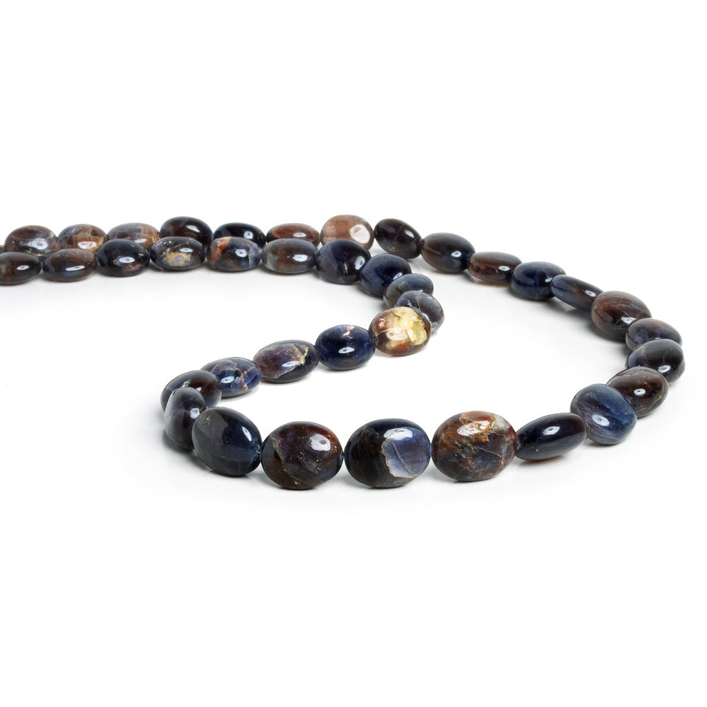 Crafted with precision, these oval beads boast a smooth, polished surface that reflects light in a mesmerizing dance of colors. The deep, intense shades of this gemstone create a unique and alluring aesthetic, adding further Sunstone affect to Iolite bodies already full of color play.