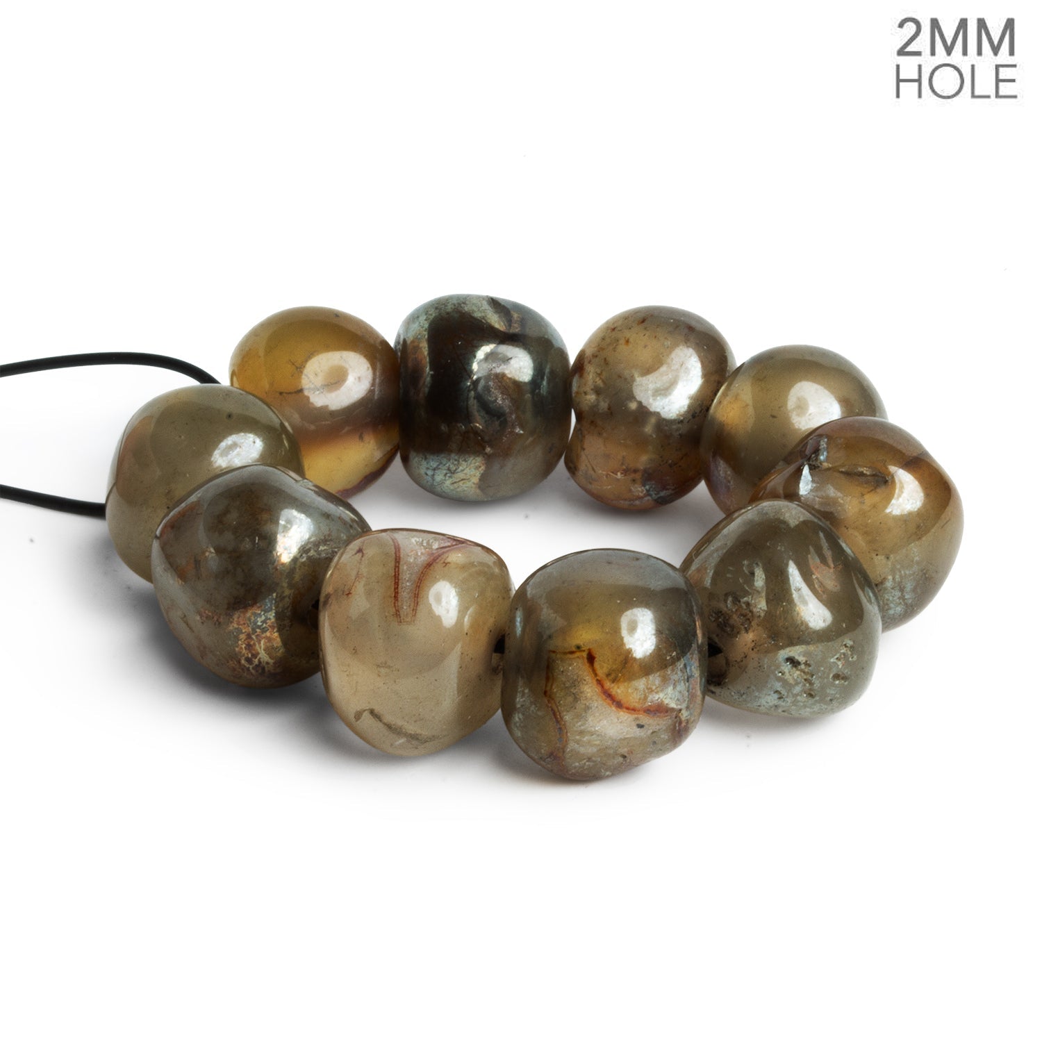 These Mystic Agate Tumbled Round Beads range from 12mm to 15mm in diameter and feature a generous 2mm hole, ideal for leather cords, thicker stringing materials, or statement designs. Each bead is richly polished to a smooth, glossy finish and reveals earthy tones of smoky bronze, mossy olive, and hints of subtle iridescence.