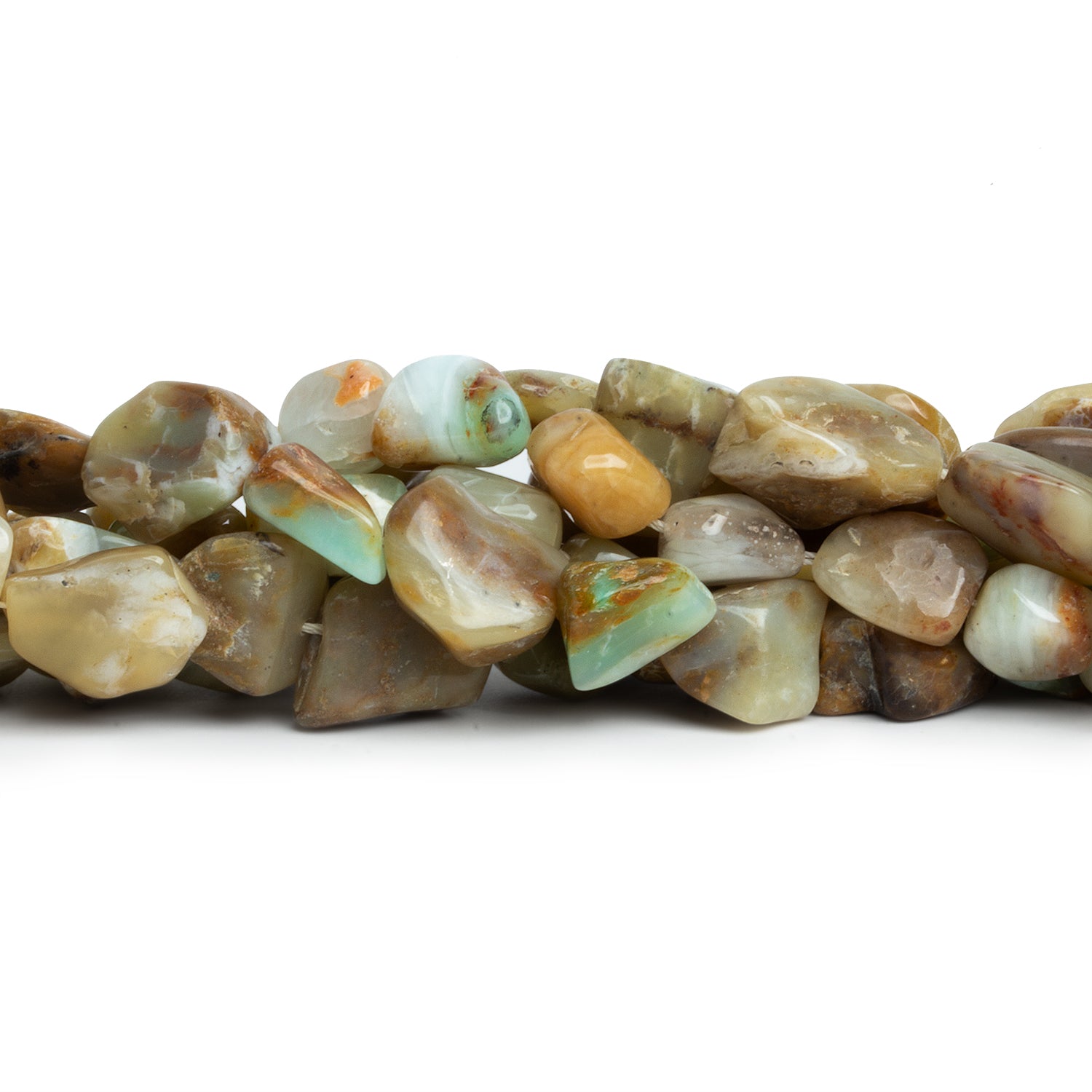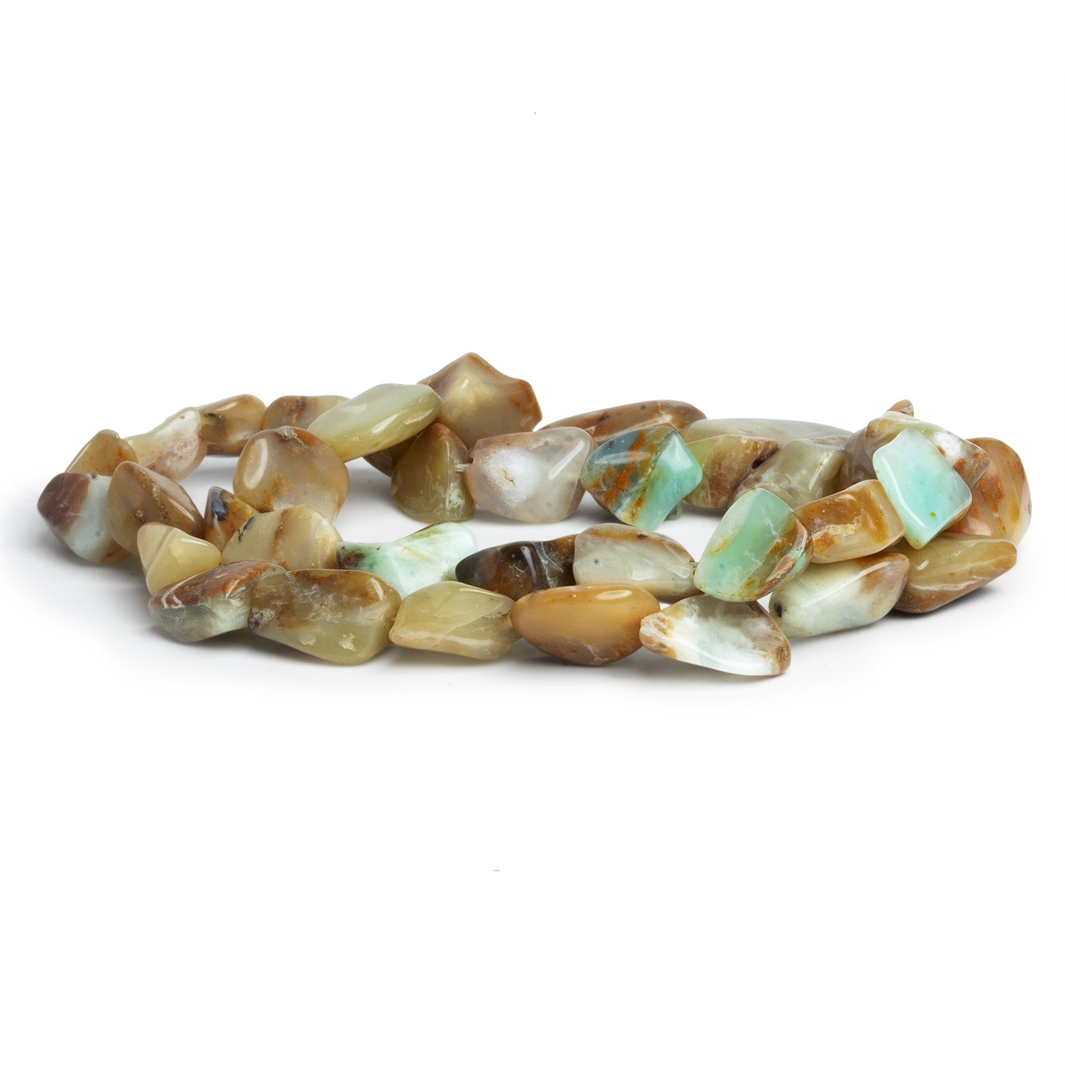 These Blue Peruvian Opal Plain Nuggets offer an earthy yet luminous blend of soft aquas, creamy beiges, and mossy browns—each stone swirled with natural matrix inclusions that make every bead uniquely yours. Their irregular nugget shapes and smooth polish highlight the organic, untamed beauty of this cherished gemstone, ranging in size from 8x7mm to 17x13mm.
