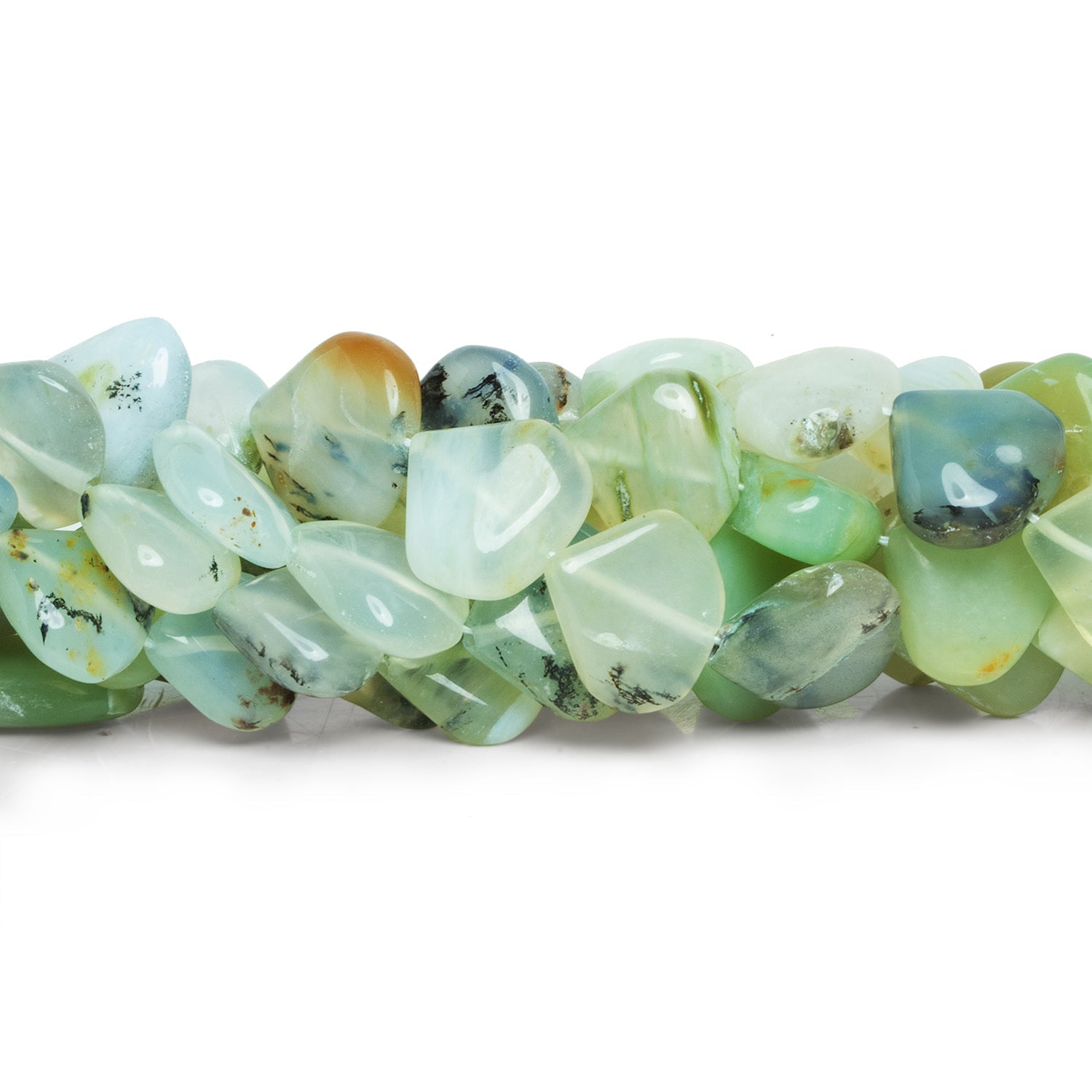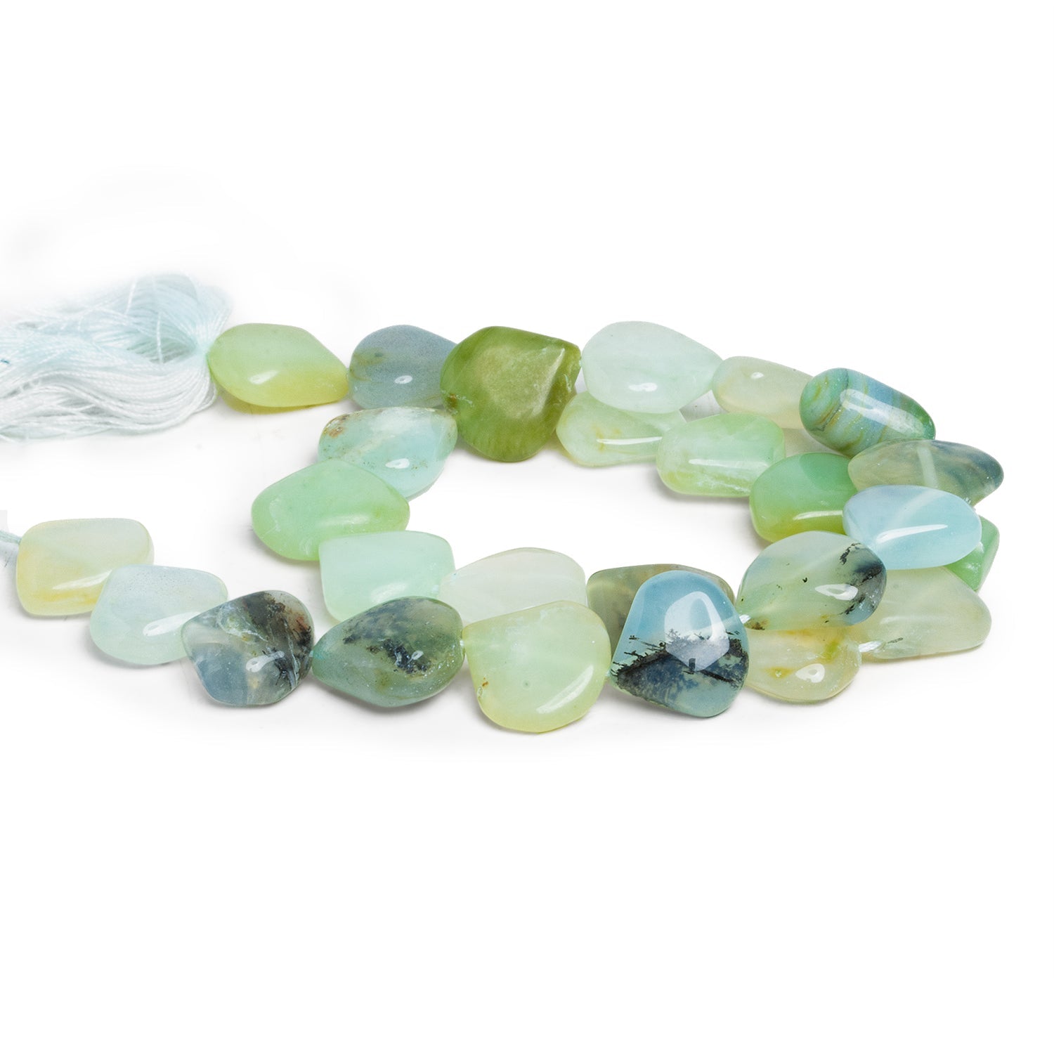 Beads range from about 14mm to 17mm in diameter. These gorgeous pieces show off a ranging color palette of Blue Peruvian Opal that includes greens, off-whites, blues and black textural accents. Expect a somewhat angular heart shape that is straight-drilled on milky to opaque bead bodies. These stunning beads are perfect for all Jewelry Design uses, from necklaces to earrings and more!