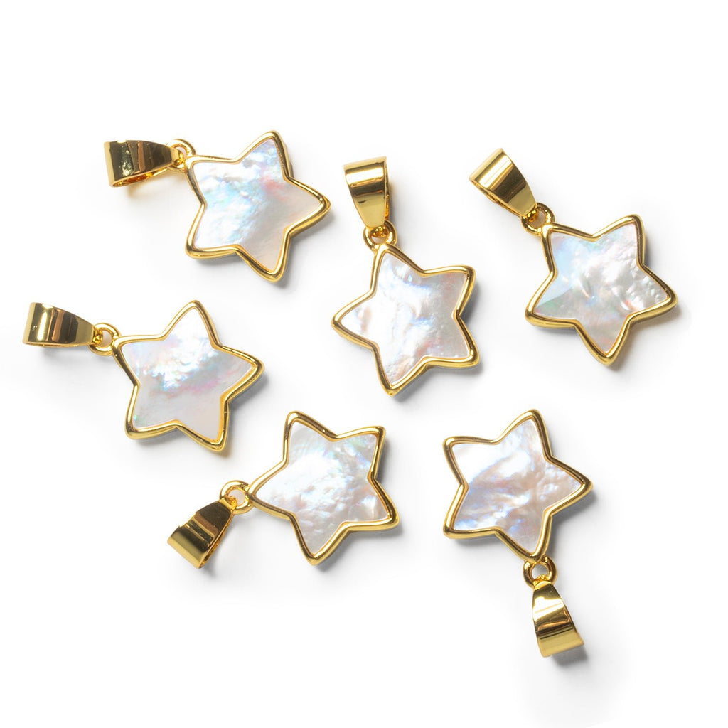 Beads measure about 14mm in diameter. These bright, star shaped bezeled focal pendants feature lightly colored Mother of Pearl enveloped in a gold-tone metal. These fun and dainty pendants are perfect for all jewelry designs from necklaces to earrings and charm bracelets.