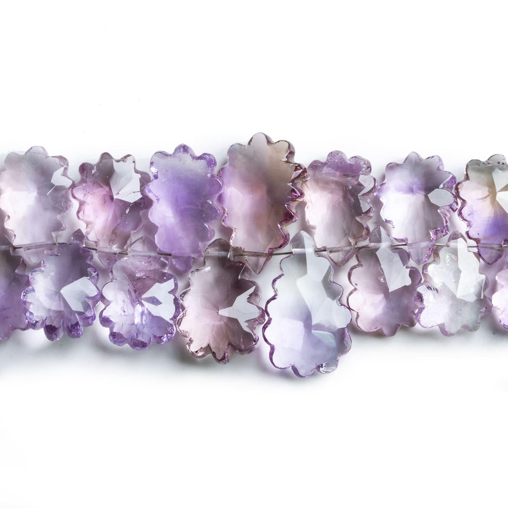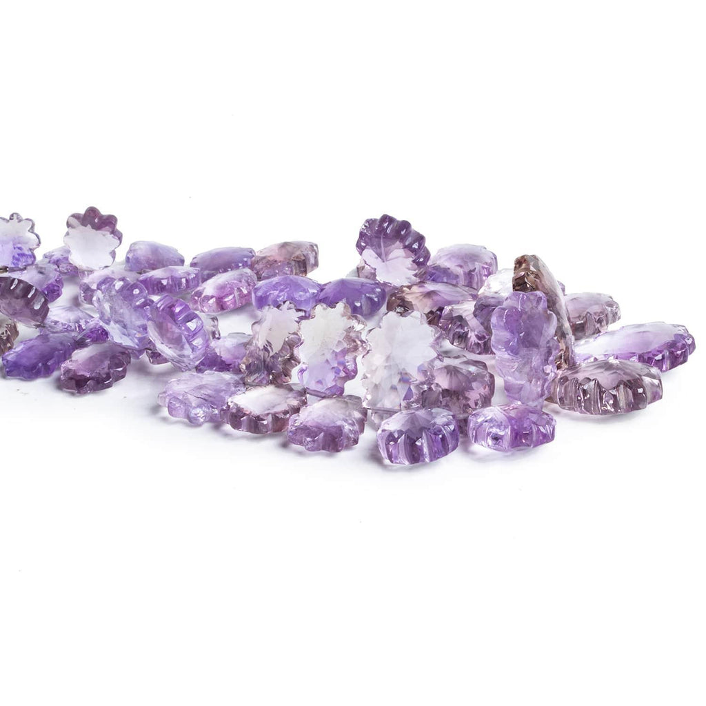 Beads range from about 10x7mm to 20x13mm. This graduated strand features exquisitely carved pear shapes with a beautiful play of color running the gamut from warm to cool Amethyst tones. Jump on this beautiful, one-of-a-kind strand sure to catch the eye in any design.