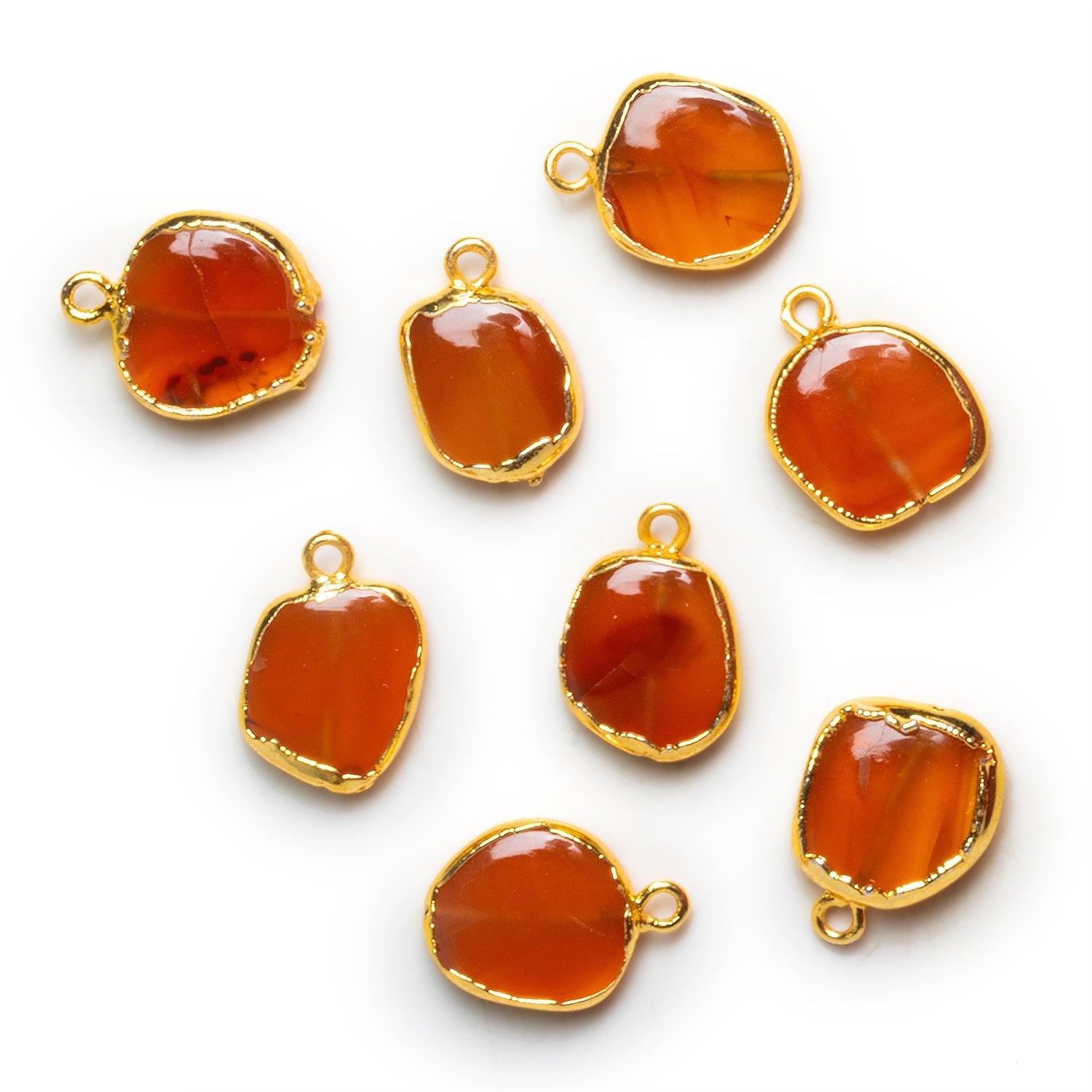 These Gold Leafed Carnelian Nugget Pendants are a vibrant and earthy addition to any jewelry collection. Each pendant features a polished carnelian stone with an organic, nugget shape, measuring approximately 16x11mm. The warm, rich orange and red hues of the carnelian are complemented by a delicate gold leaf edge, adding a luxurious contrast to the stone's natural beauty.