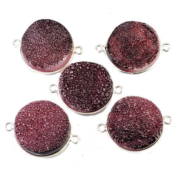 18mm Coin Purple Drusy Sterling Silver bezeled connector beads are hand crafted with precision measurements to showcase these color treated Drusy gemstones.