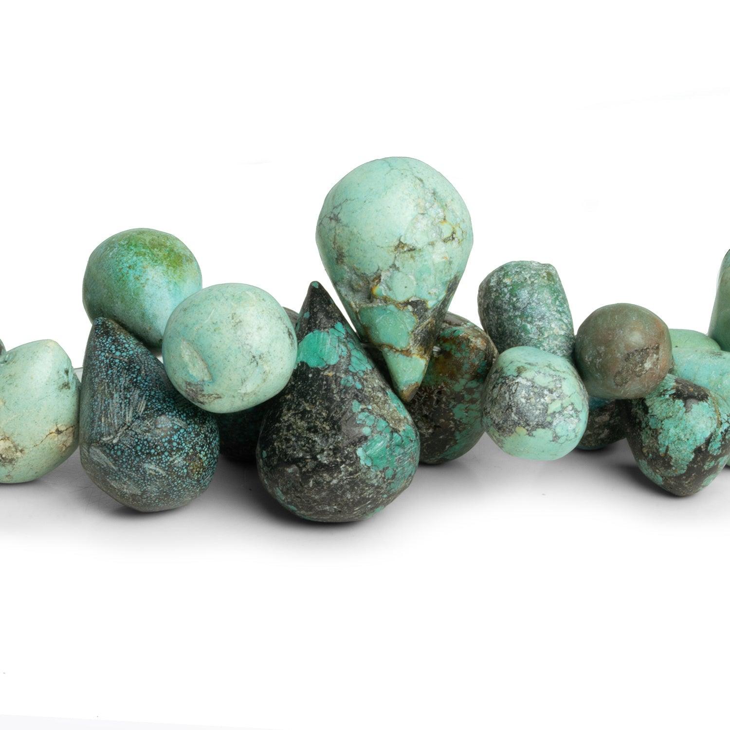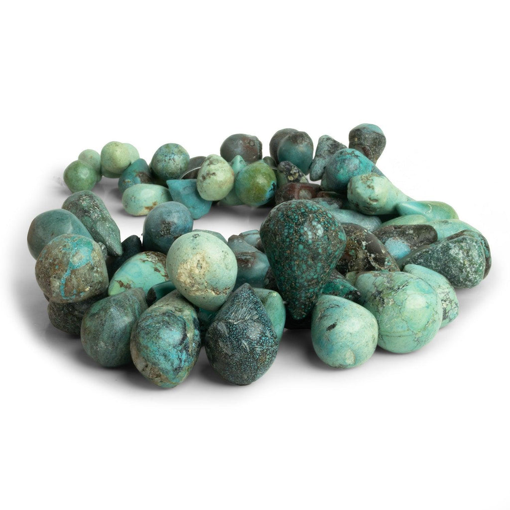 Beads range from about 9x7mm to 26x17mm. These Chinese Turquoise pieces feature a vibrant Turquoise blue color palette with green and Robin's egg accents. Expect exciting organic textures and patterns across thick teardrop shapes.