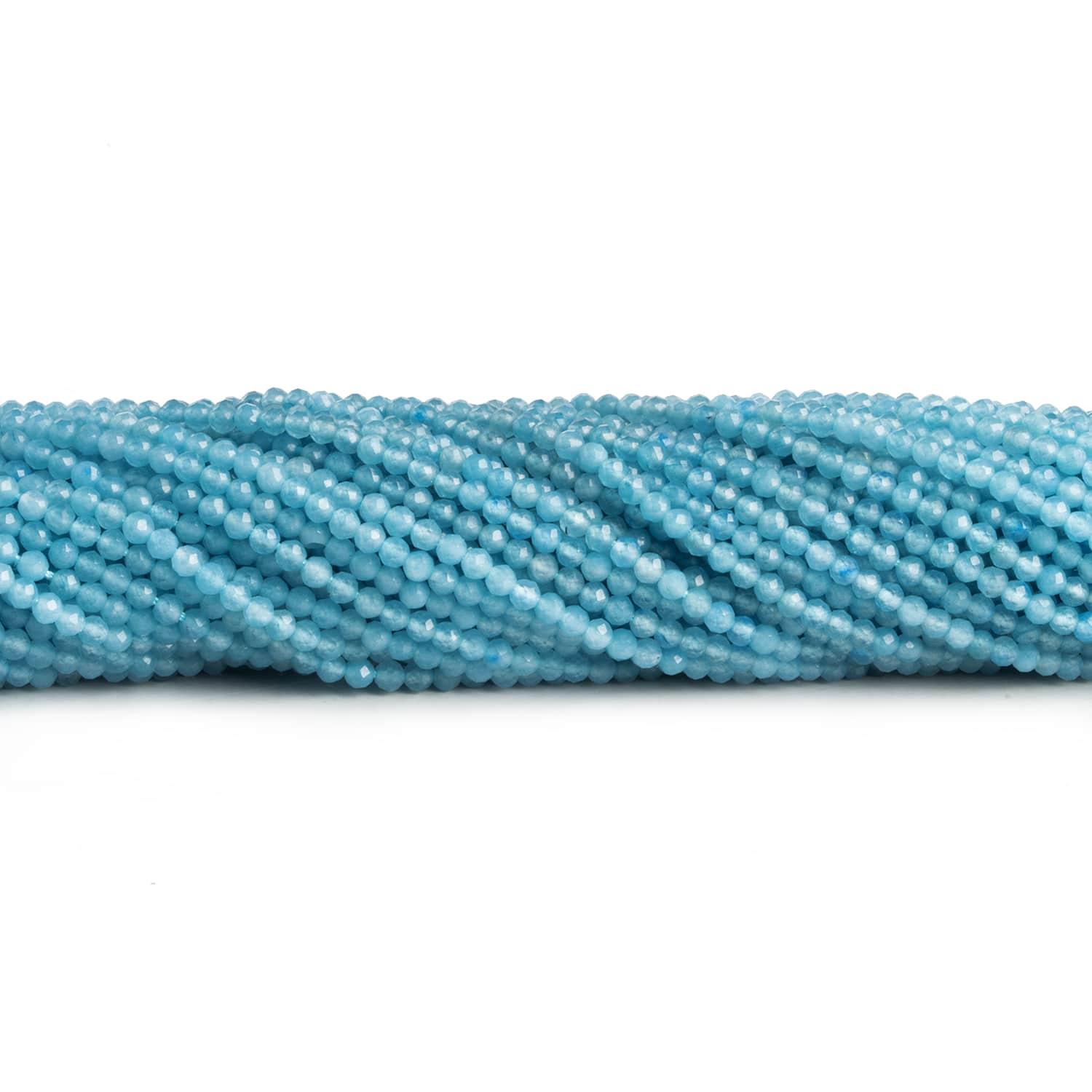 Beads measure 2mm to 2.2mm in diameter with very minor variation in size across these precision-faceted beauties. These strands feature a light blue coloration that is highly consistent across the strand.