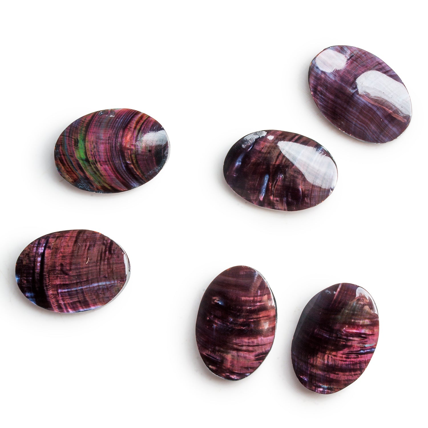 These Burgundy Mother of Pearl Oval Focal Beads are a rich, luminous choice for jewelry designs that call for both elegance and organic charm. Measuring approximately 20x15mm, each oval is cut from natural shell and polished to a high gloss, revealing deep burgundy tones with iridescent flashes of violet, copper, and even green depending on the light.