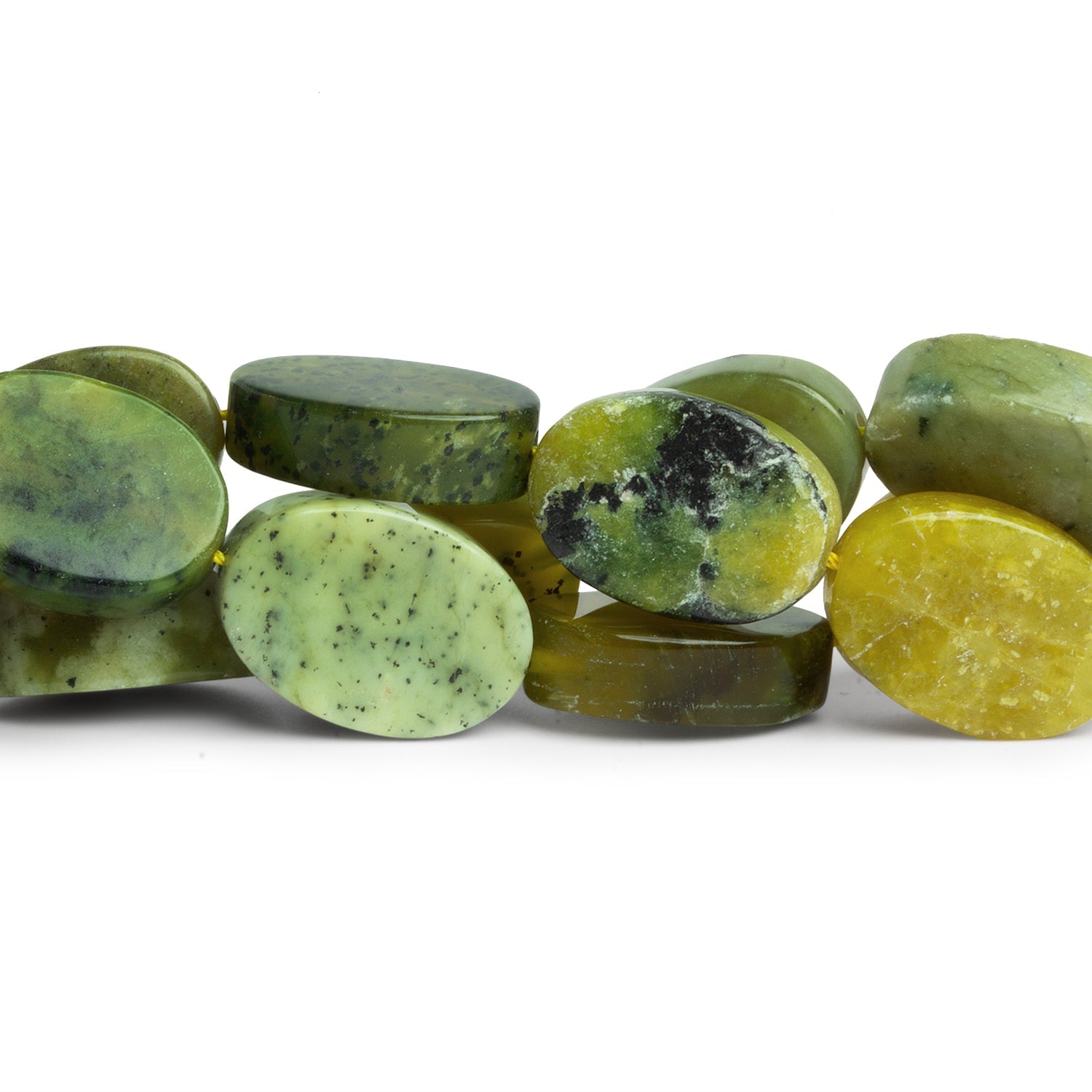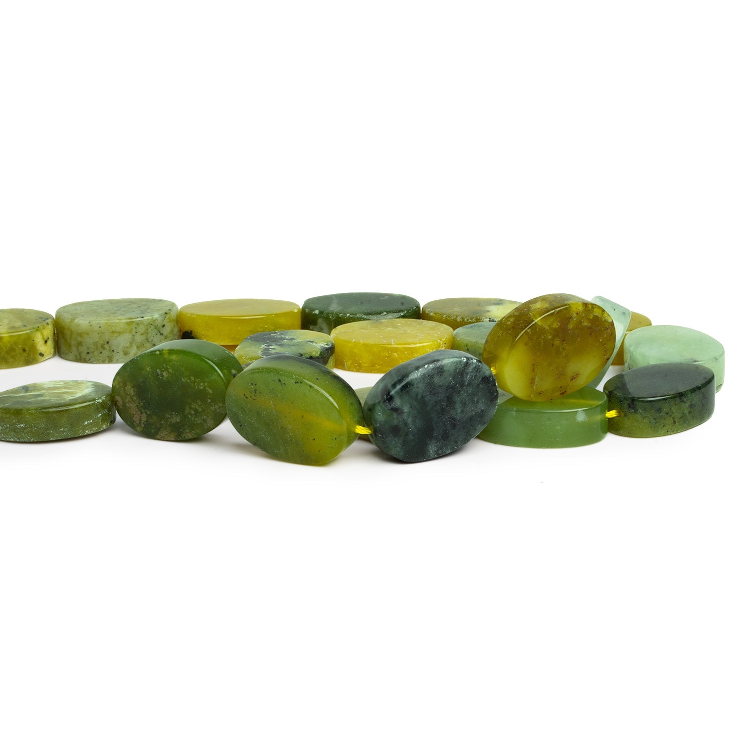 These Serpentine Plain Oval Beads showcase a medley of earthy greens, from deep forest tones to soft, mossy hues, along with marbled patterns and occasional flecks of black. Each oval has been smoothly polished to highlight the natural beauty and variations of the stone, resulting in a rich, organic look that evokes the grounded energy of nature.