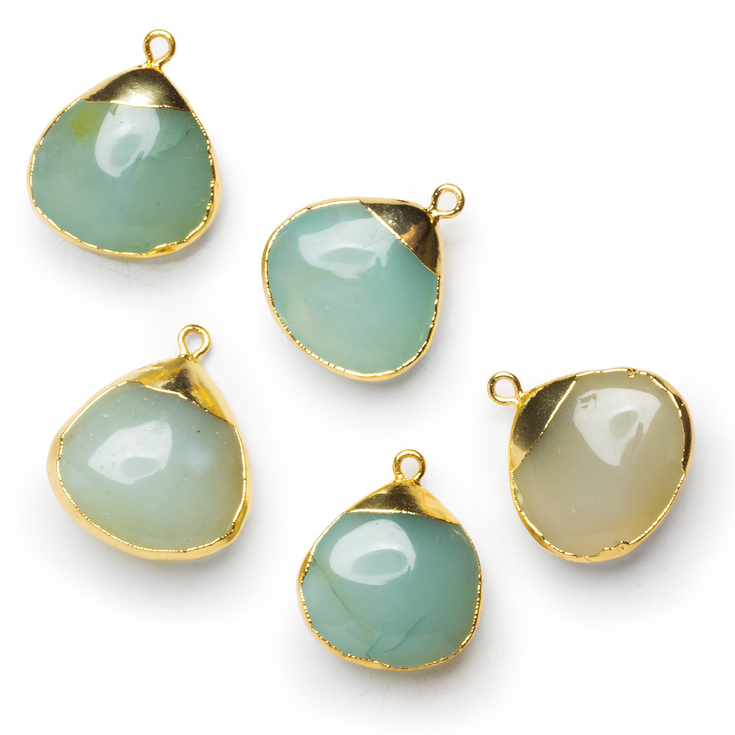 These Blue Chalcedony Gold Leafed Heart Pendants are a stunning choice, measuring an average of 21mm. The pendants feature the same beautiful blue chalcedony, celebrated for its soft, translucent glow. The gold leaf accent at the top offers a luxurious and rich contrast to the cool tones of the chalcedony, creating a harmonious balance between elegance and nature. The heart shape of these pendants adds a romantic touch, making them perfect for creating sophisticated, eye-catching jewelry pieces that are both timeless and unique. Ideal for necklaces, they’ll bring an added layer of refinement to any design.