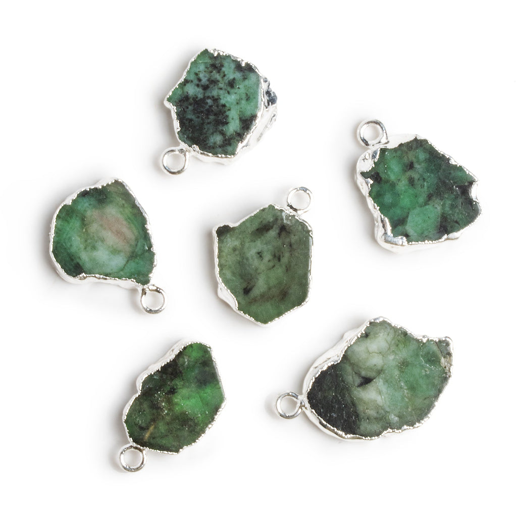 Beads measure about 21x16mm. These incredible Emerald pieces feature rich green opaque emerald in a natural slice shape that looks amazing enveloped in our silver leaf. These colorful, organic-looking designs are sure to catch the eye as the focal bead of necklaces, as earrings, and more!