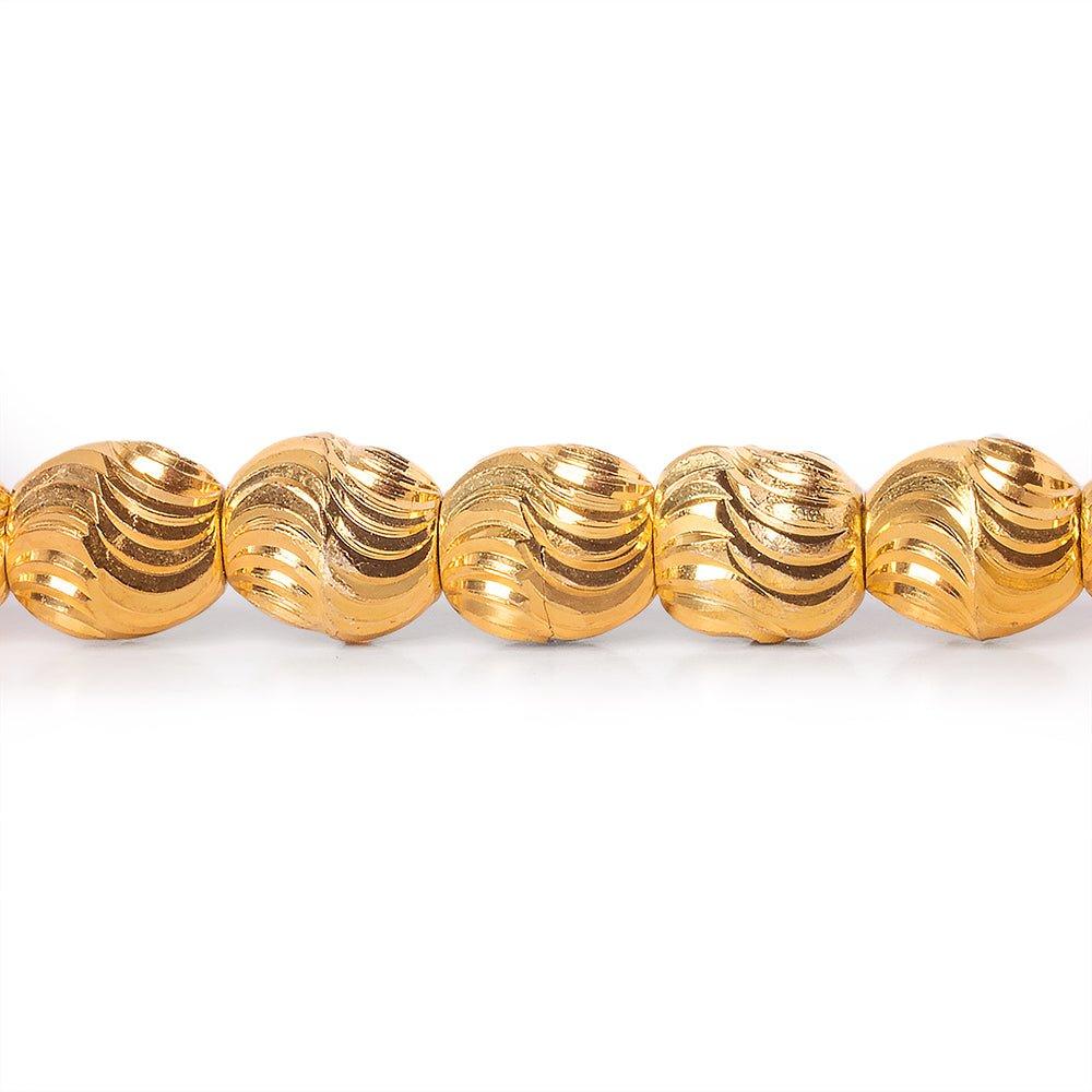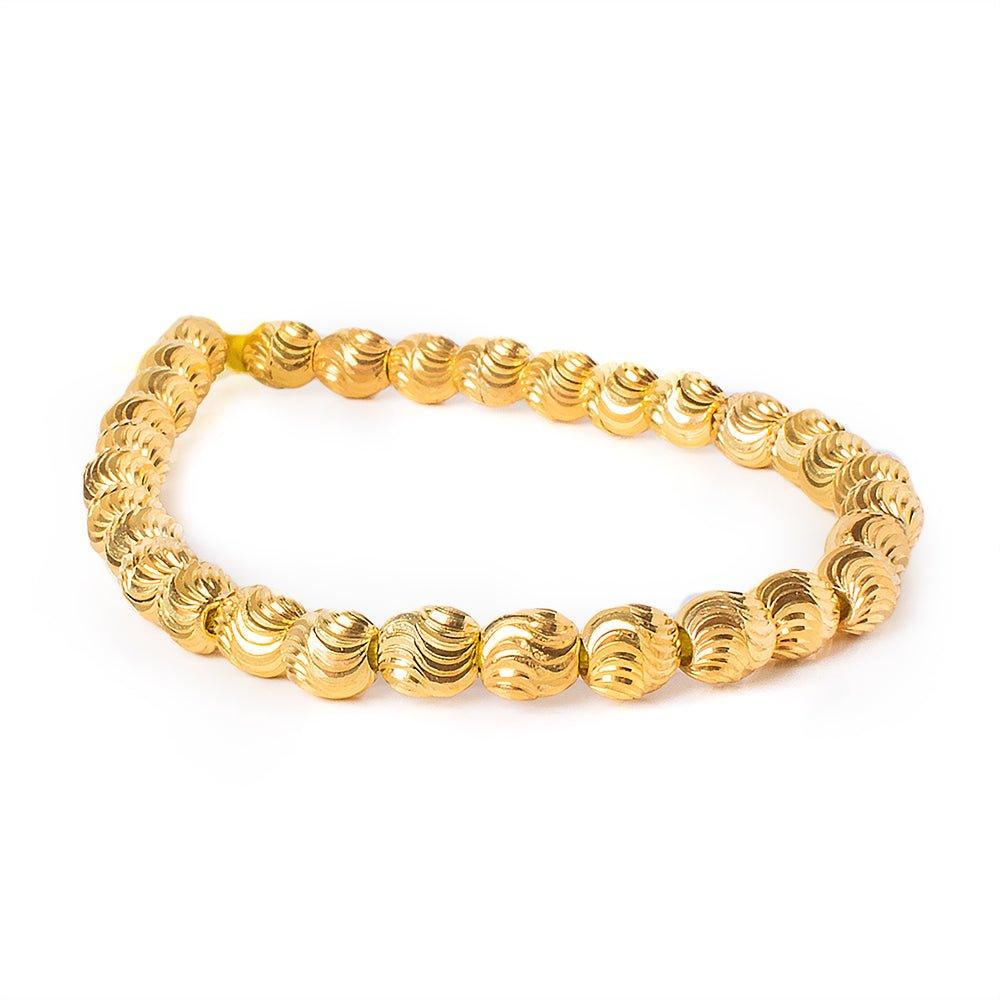 These 22kt Gold Plated Brass Wave Cut Oval Beads shimmer with radiant golden brilliance, highlighted by a wave-patterned diamond cut that reflects light in fluid, eye-catching motion. Measuring approximately 8mm, each oval bead combines the luxury of 22kt gold plating with the strength of brass, creating a durable yet refined component for your jewelry designs. The elegant wave motif adds both texture and movement, giving these beads a distinctive, high-end appearance.