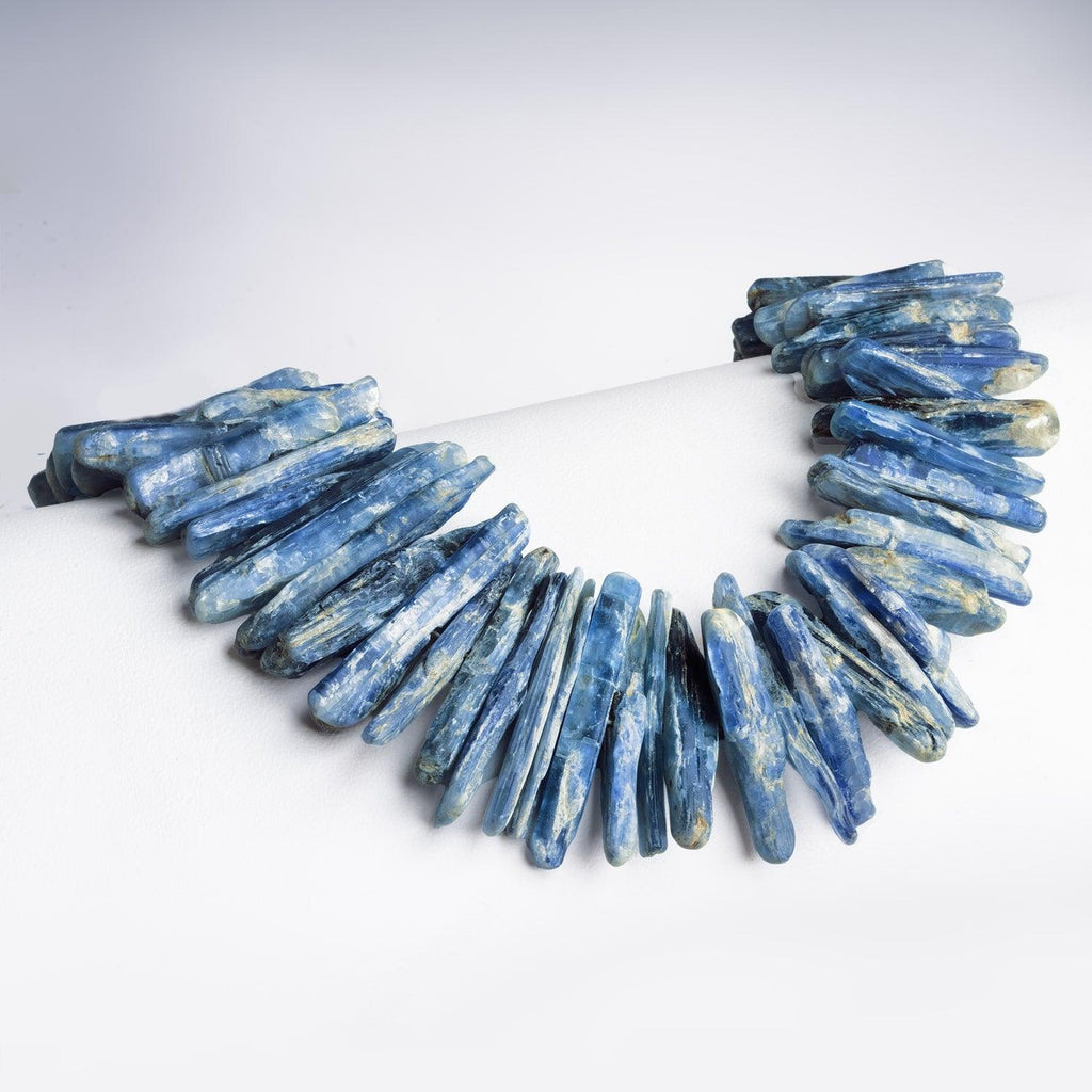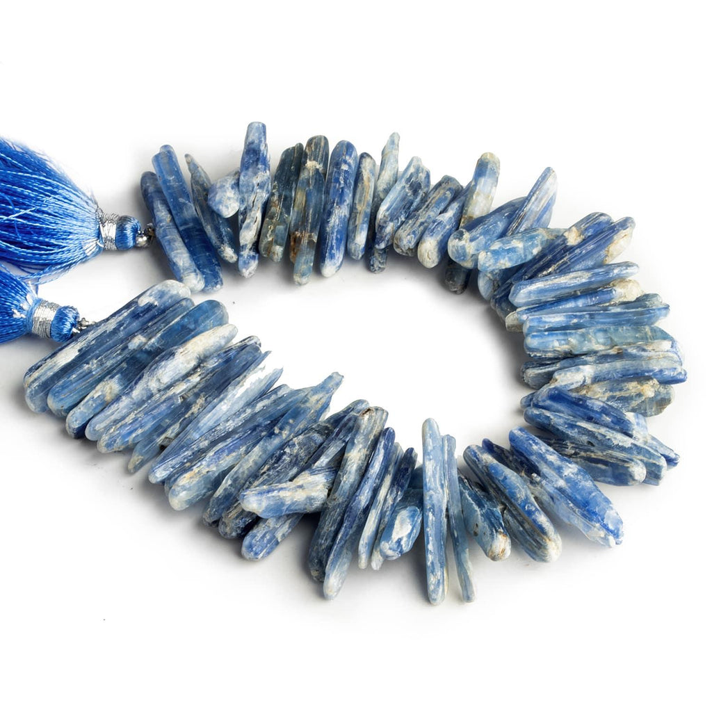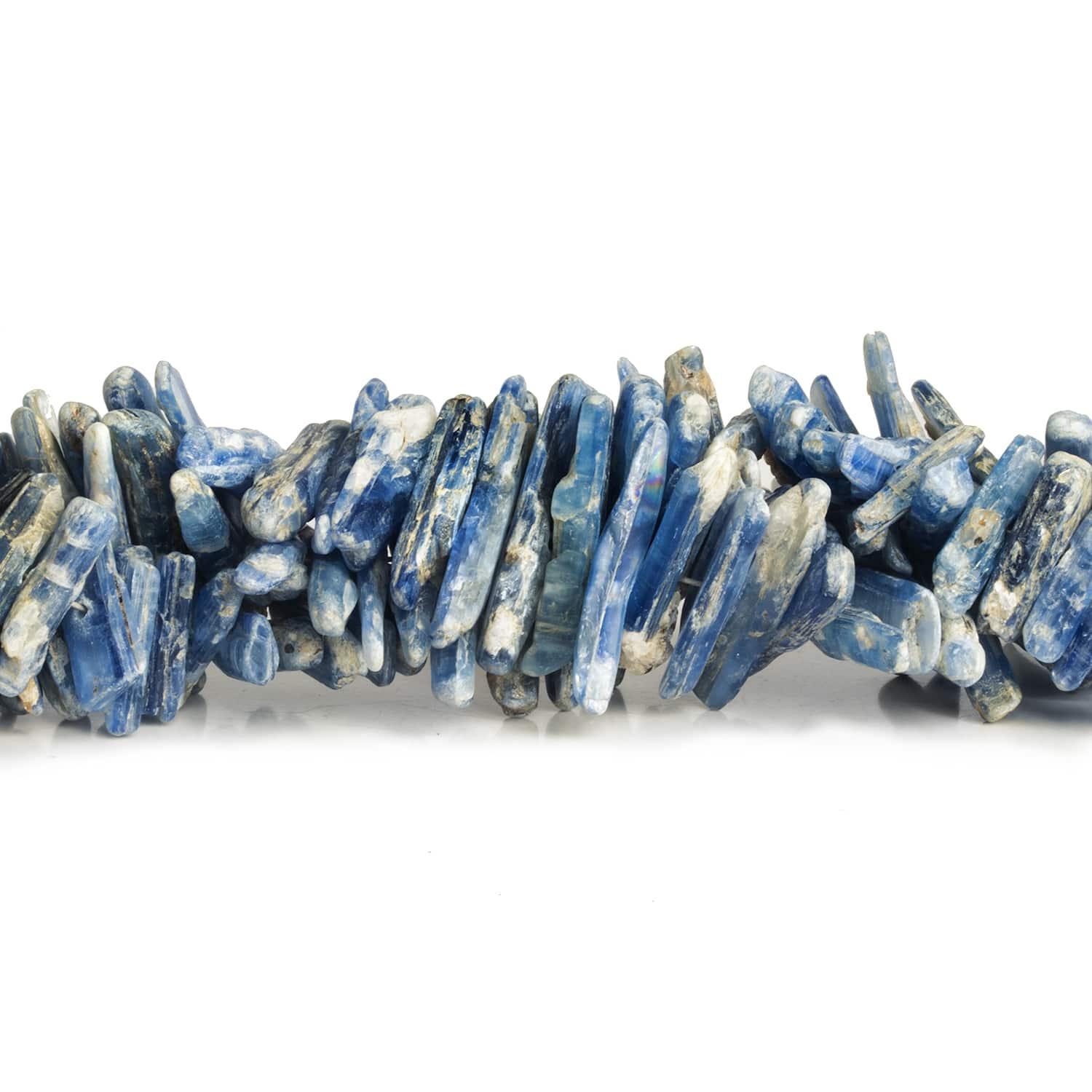 Beads range from about 15x5mm to 20x6mm. Expect sizes to vary significantly both on and between strands of these elongated natural crystal shapes. These curated Kyanite strands feature a beautiful blue color that highlights the striated textures of this much sought-after gemstone. Kyanite aficionados will find myriad uses in these sure-fire favorites, epitomizing the organic allures of the natural crystal bead.