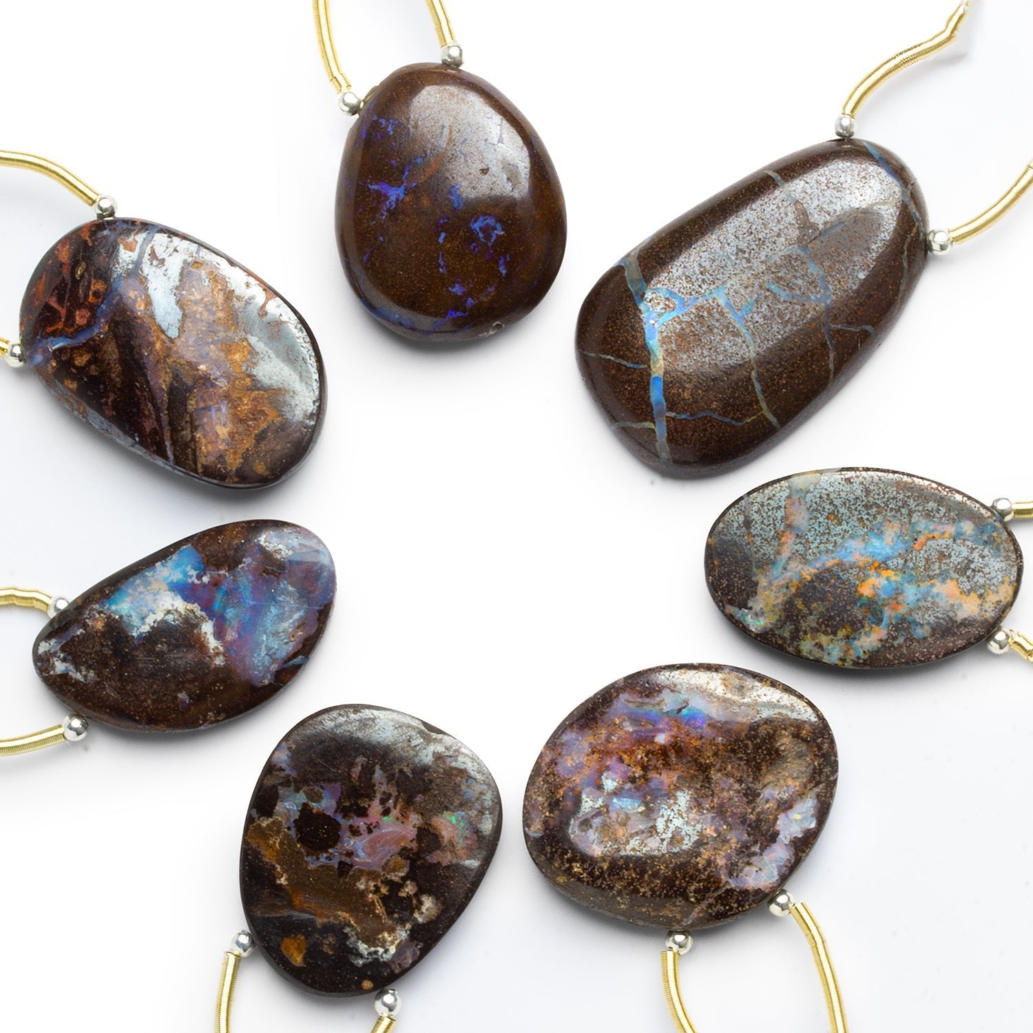 These Australian Boulder Opal Nugget Focal Beads, averaging 27x20mm, offer a striking mix of earthy richness and vibrant fire. Each bead showcases unique veins and pools of electric blue, violet, and amber flashing through natural brown ironstone—a geological canvas millions of years in the making.