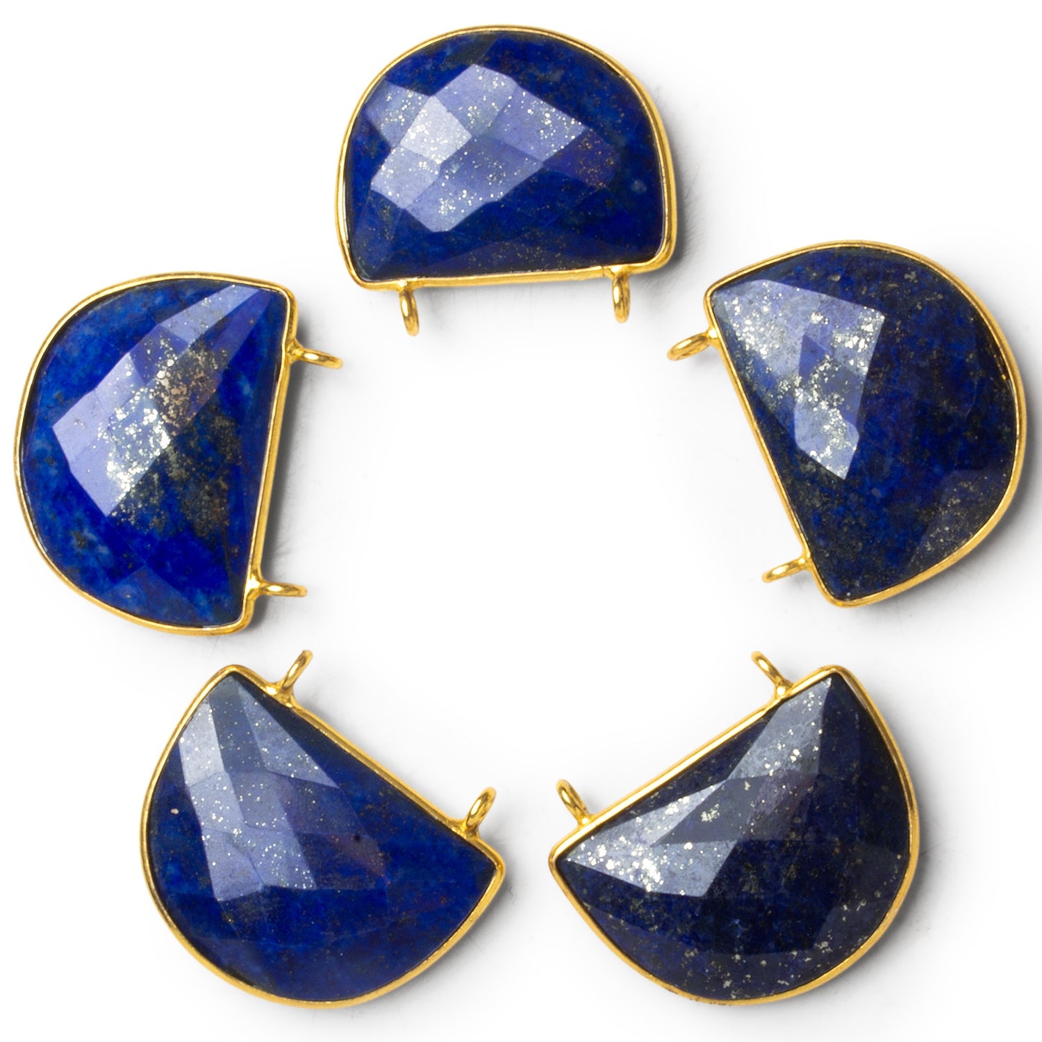 These Vermeil Bezeled Lapis Lazuli Half-Moon Connectors feature a unique and versatile silhouette that adds balance and artistry to any jewelry design. Each connector showcases a radiant half-moon shape of deep blue Lapis Lazuli, flecked with shimmering pyrite and finely faceted for elegant light play. Framed in lustrous gold vermeil, the smooth bezel complements the gem’s rich natural texture.
