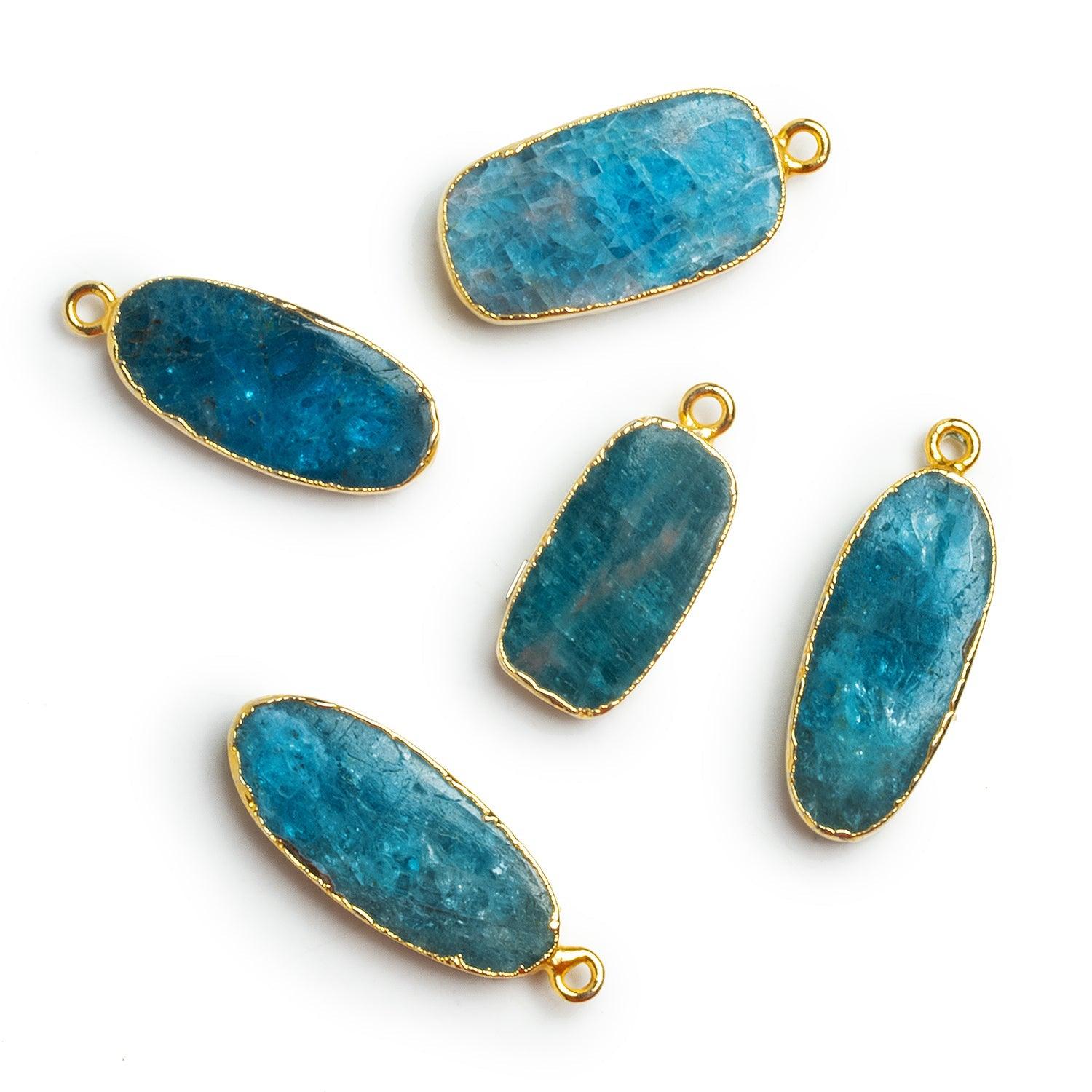 Beads average about 29x12mm. These pendants show of a vibrant, Neon Blue Apatite color that looks amazing enveloped in our signature gold leaf.