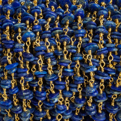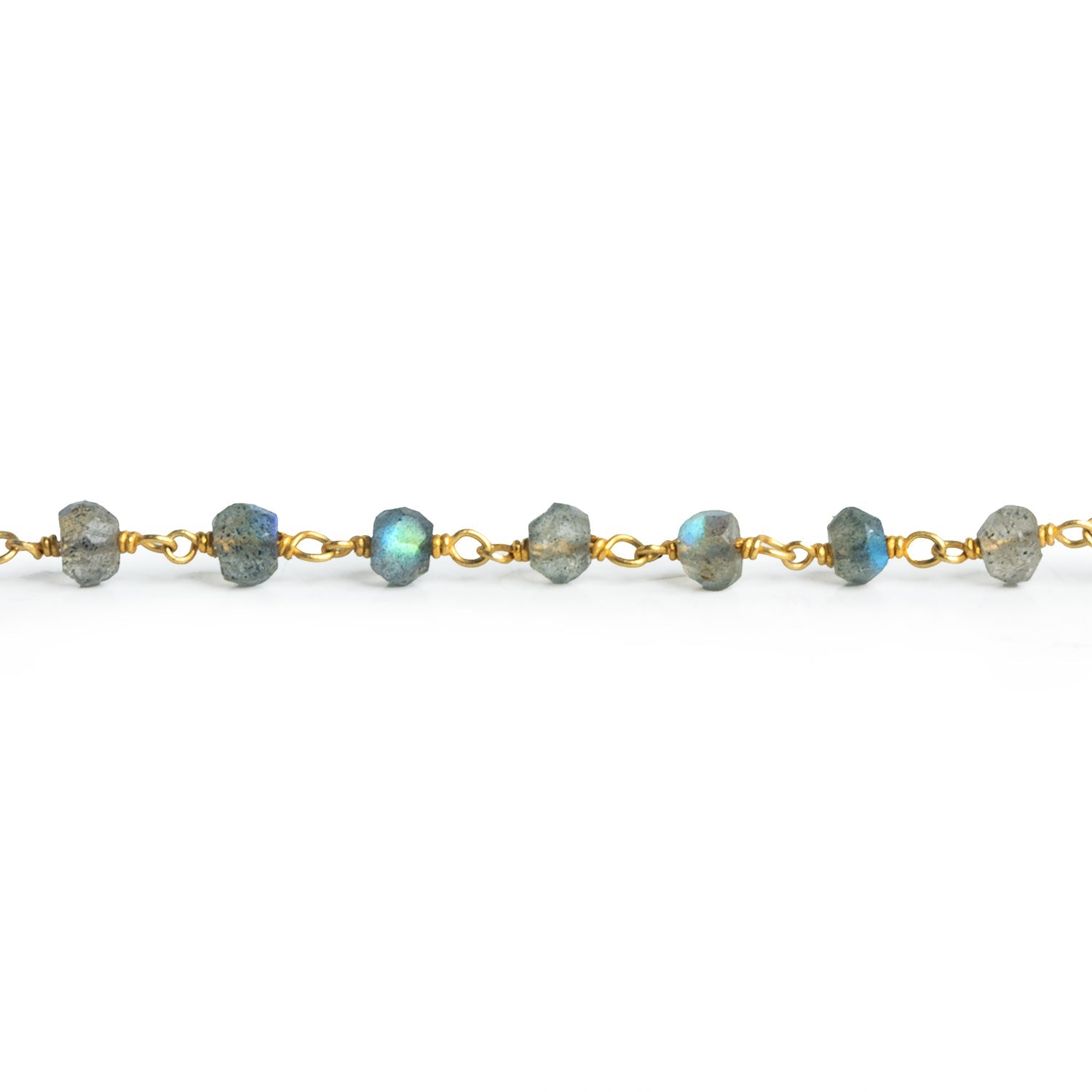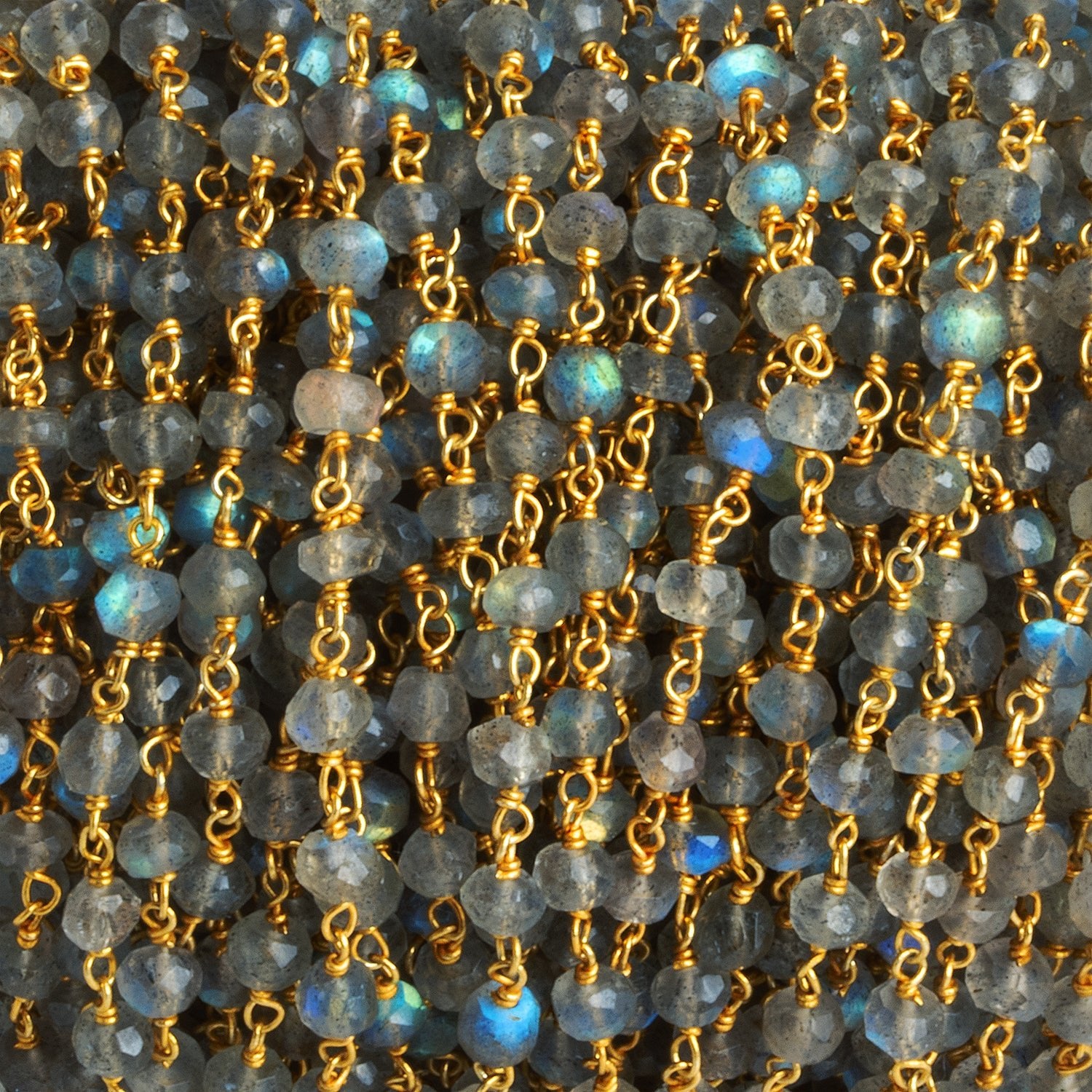 This Labradorite Faceted Rondelle Gold Chain showcases shimmering 3.5mm to 4mm beads, expertly faceted to enhance the gem’s natural flash. Each stone is hand-wrapped with radiant gold-finished wire, creating a continuous strand of luminous blue-green fire dancing across a smoky gray backdrop.