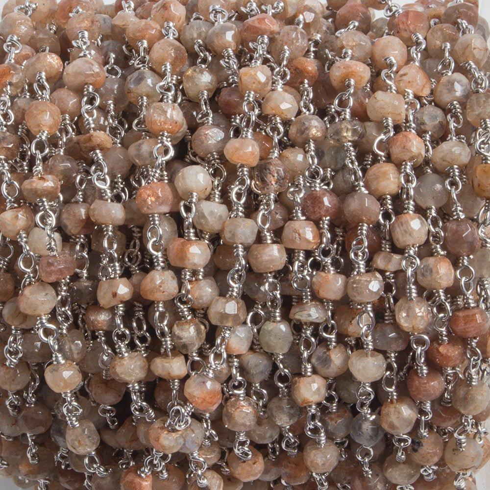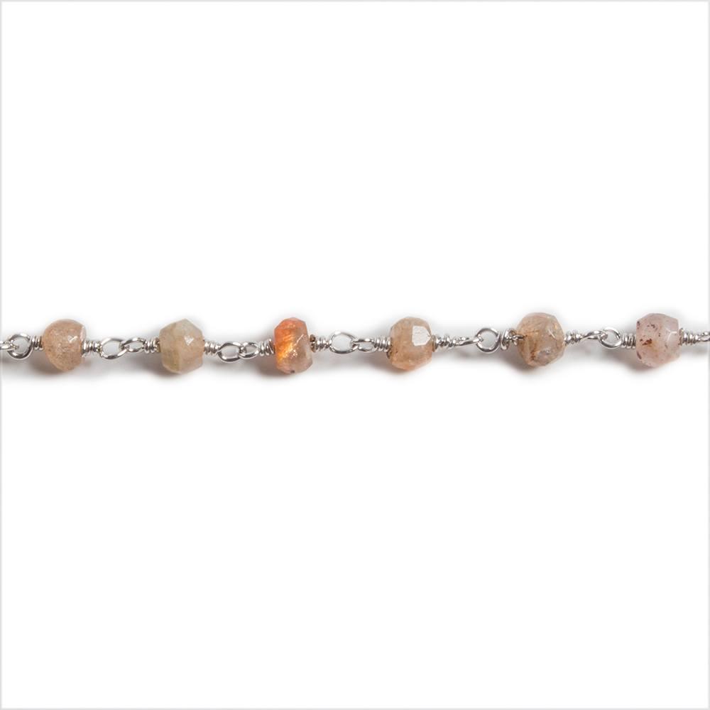 3.8mm Sunstone faceted rondelle Silver plated Chain by the foot with approximately 35 pieces per 12 inches. Beaded Rosary Style hand wrapped Chain is custom produced in-house from our bead strands so that you can match or mix.