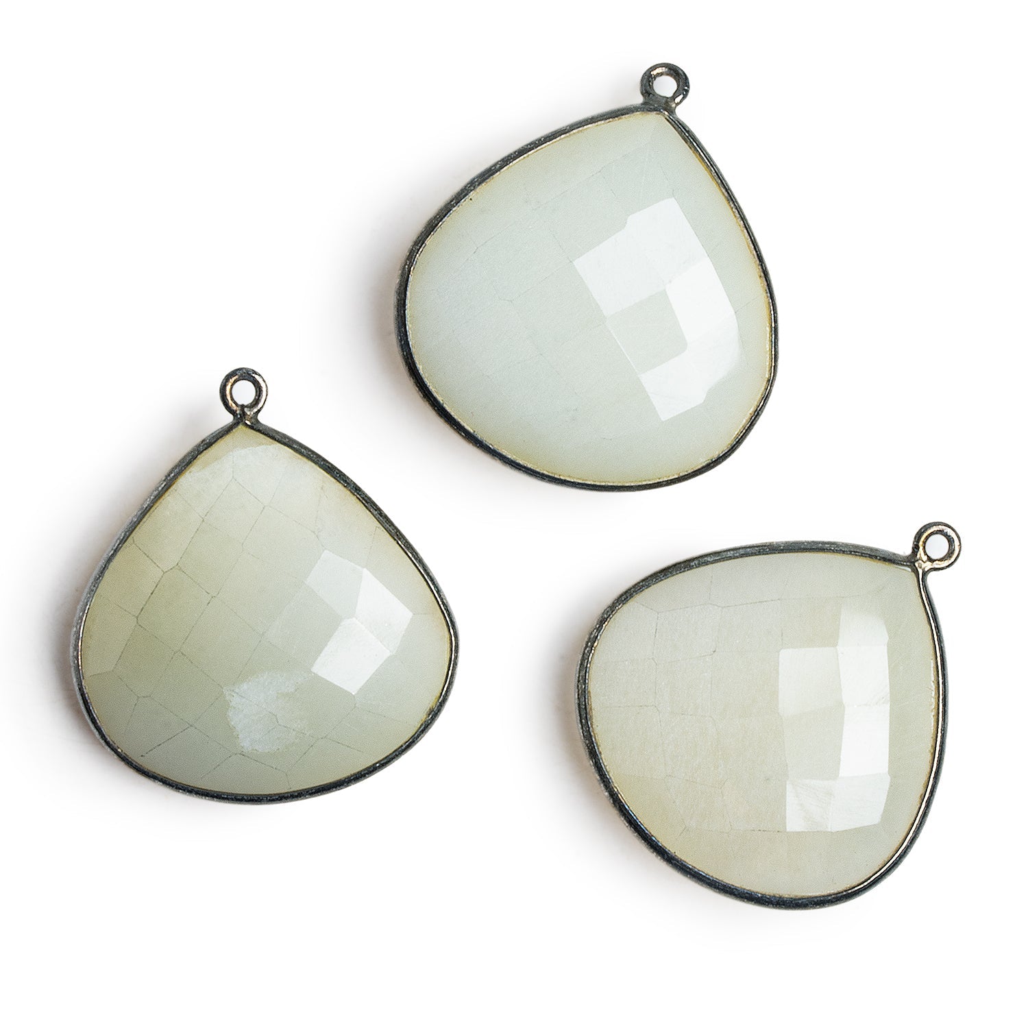 Beads measure about 30mm in diameter. These gorgeous pieces show off a milky white Moonstone body featuring exquisite faceting, enveloped in our signature black gold plated sterling silver bezeling.