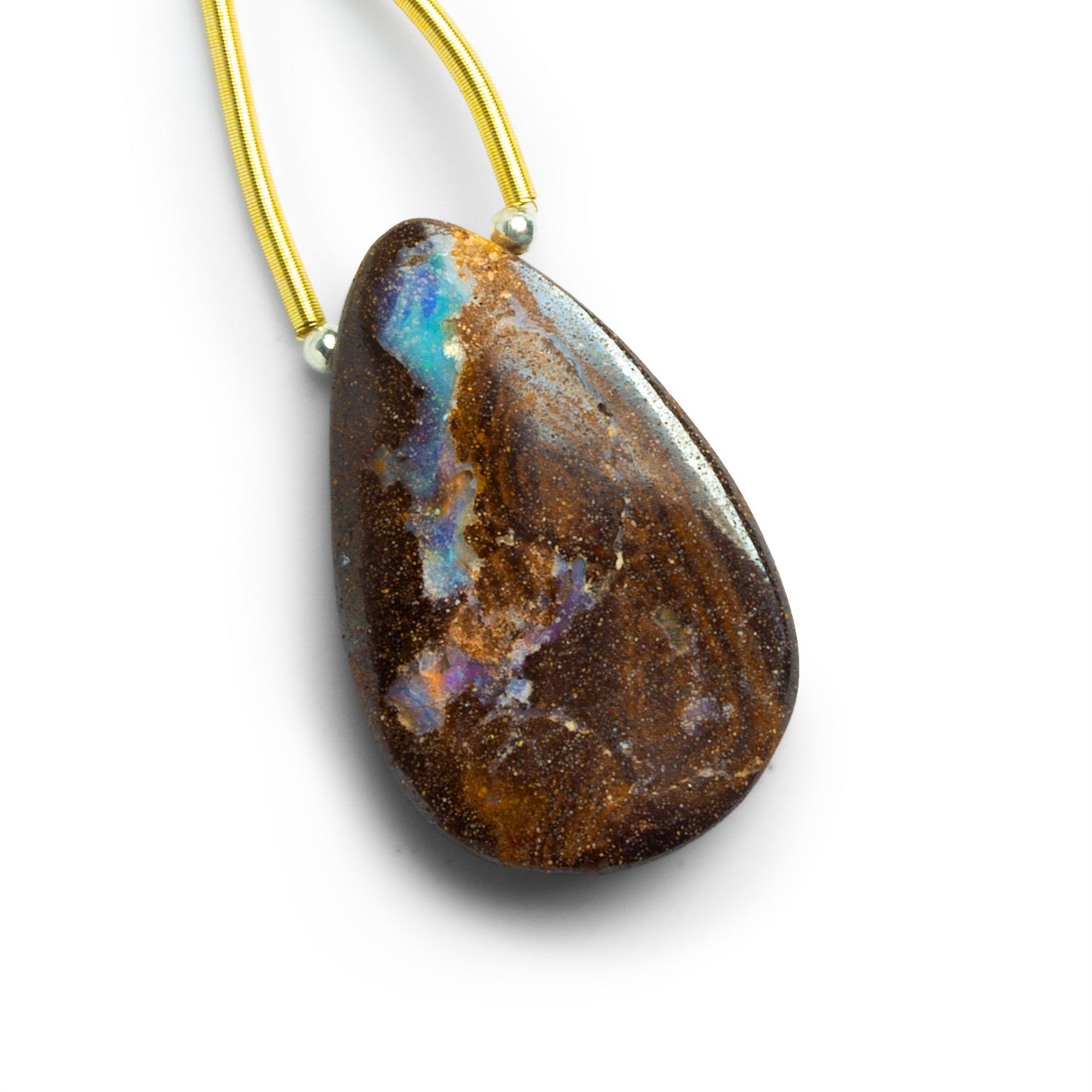 This 30x20mm Australian Boulder Opal Nugget Focal Bead is a natural statement-maker, featuring vivid flashes of electric blue, turquoise, and lilac drifting through rich chocolate-brown ironstone. The teardrop silhouette and high-polish finish bring out the stone’s celestial fire and earthy texture in perfect harmony.