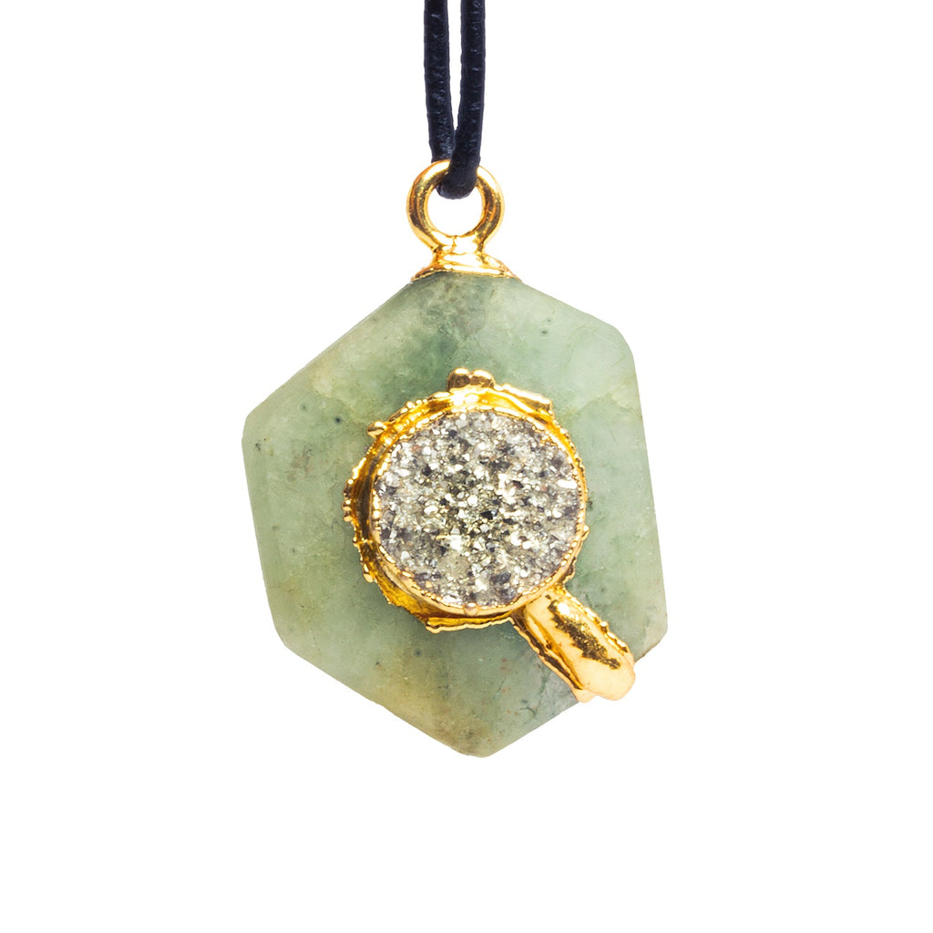 This eye-catching pendant pairs the calming energy of raw aquamarine with the high sparkle of a silvery metallic drusy. The soft green-blue aquamarine serves as a grounding backdrop for the gleaming circular drusy, set in a rich gold leaf accent that feels both organic and regal.