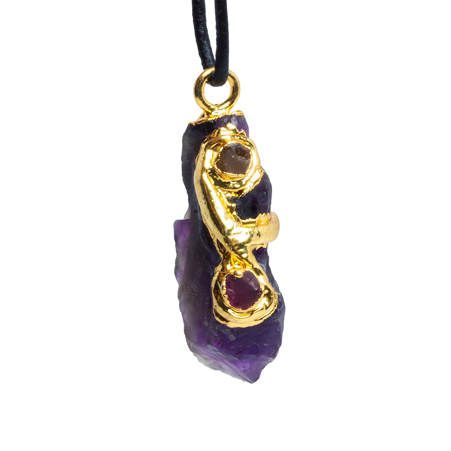 A deep violet Amethyst base forms the foundation of this bold pendant, naturally faceted and full of crystalline texture. Two vibrant Ruby accents—one with a pinkish fire, the other with a richer wine tone—are set vertically in brilliant gold leaf, creating a cascading effect that adds elegance and movement.