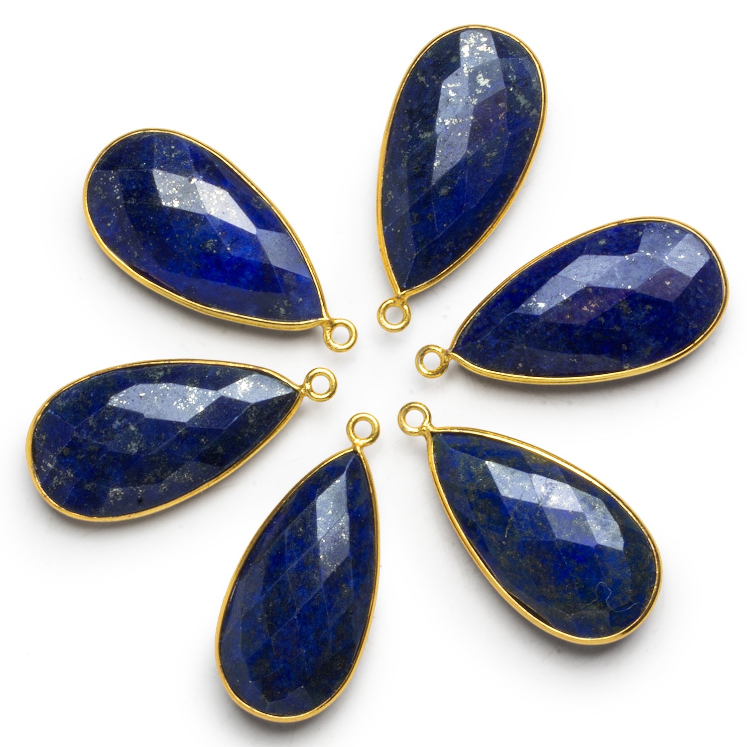 These Vermeil Bezeled Lapis Lazuli Pear Pendants offer a striking balance of elegance and earthy richness. Each pendant features a faceted pear-cut Lapis Lazuli stone measuring approximately 35x17mm, glowing with vibrant ultramarine tones and flecks of natural pyrite that give it a celestial shimmer.