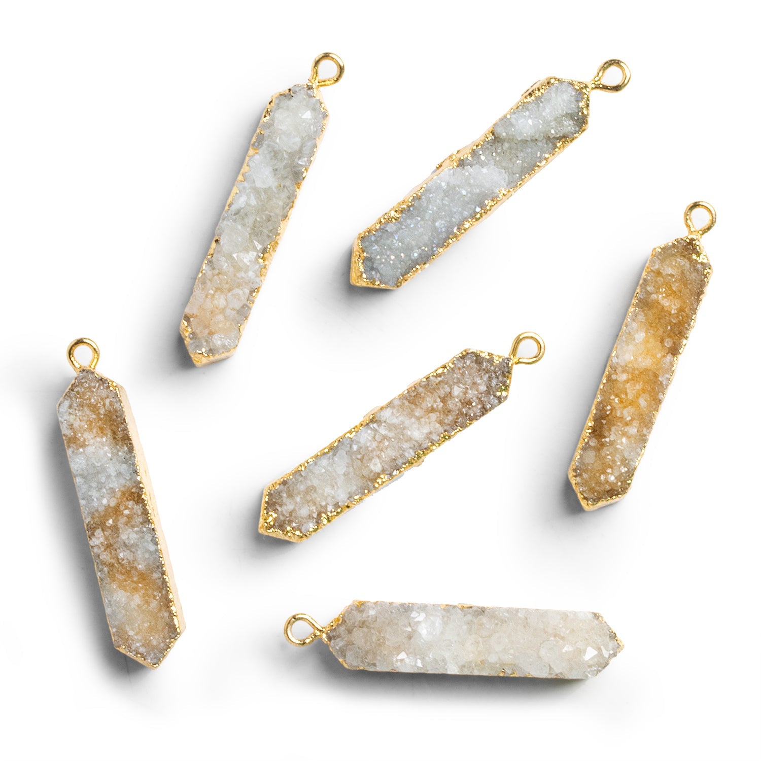 Beads measure about 36x7mm with a few mm of variation possible. These elongated, pointed-bar shapes feature the glittering sparkle coveted by fans of Drusy in spades. These white to rust toned natural drusy pieces look amazing enveloped in our signature gold leaf. Imbue your designs with the elegant allure of Drusy with these gorgeous focal beads, ideal for bringing together necklaces, bold earrings and much more.