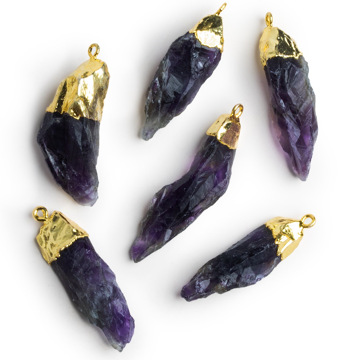 These Gold Leafed Amethyst Natural Crystal Pendants feature the deep, rich purple tones of raw amethyst crystals, complemented by a striking gold leaf cap. Ranging from 31x9mm to 43x18mm, each pendant showcases the raw, unrefined beauty of amethyst, with natural crystal formations that capture the light and create a captivating sparkle. The luxurious gold leaf top enhances the stone's vibrancy, creating an elegant contrast between the deep amethyst hues and the warm gold.