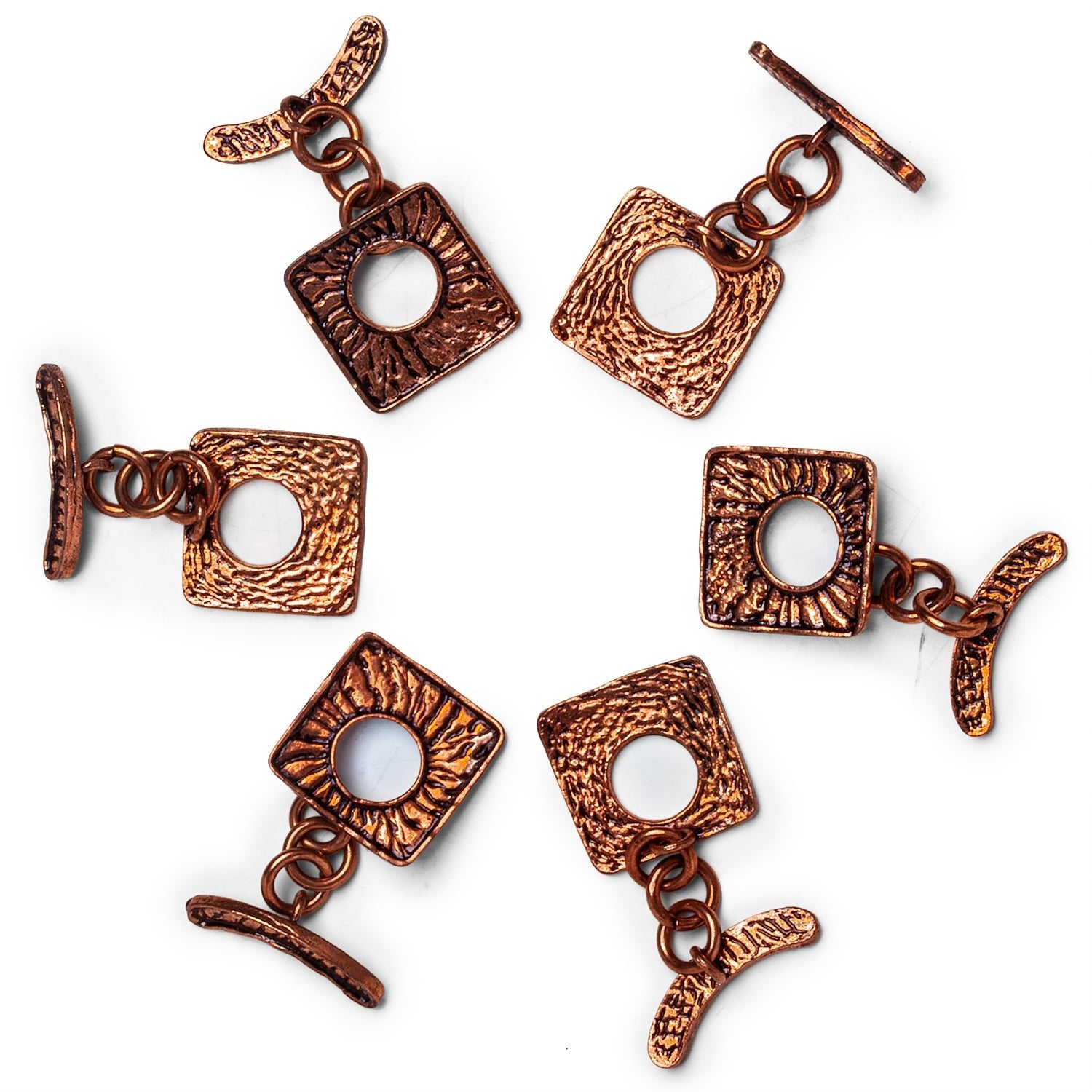 Infuse your jewelry with bold geometric charm using these Copper Square Sunburst Toggles. Measuring approximately 37x18mm, each toggle is crafted with a radiant sunburst pattern etched into a square ring, enhanced by a richly antiqued copper finish. The matching toggle bar features a subtle hammered texture and connects with sturdy copper rings for ease of use and secure closure.