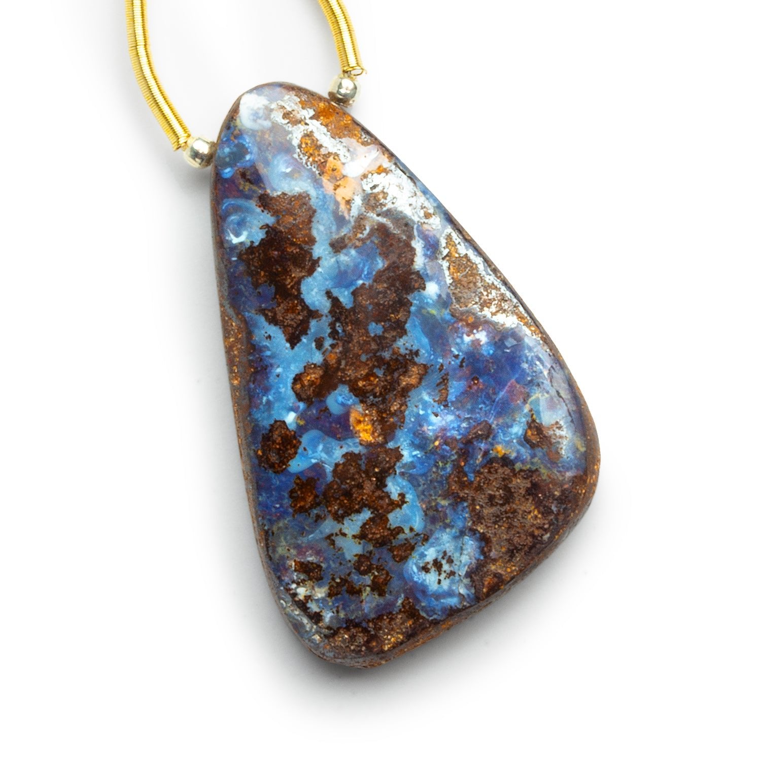 This 39x25mm Australian Boulder Opal Nugget Focal Bead bursts with vivid electric blues and fiery copper hues, creating a natural mosaic across its teardrop-shaped surface. The dynamic interplay between opalized veins and earthy ironstone gives this piece an untamed, elemental beauty.