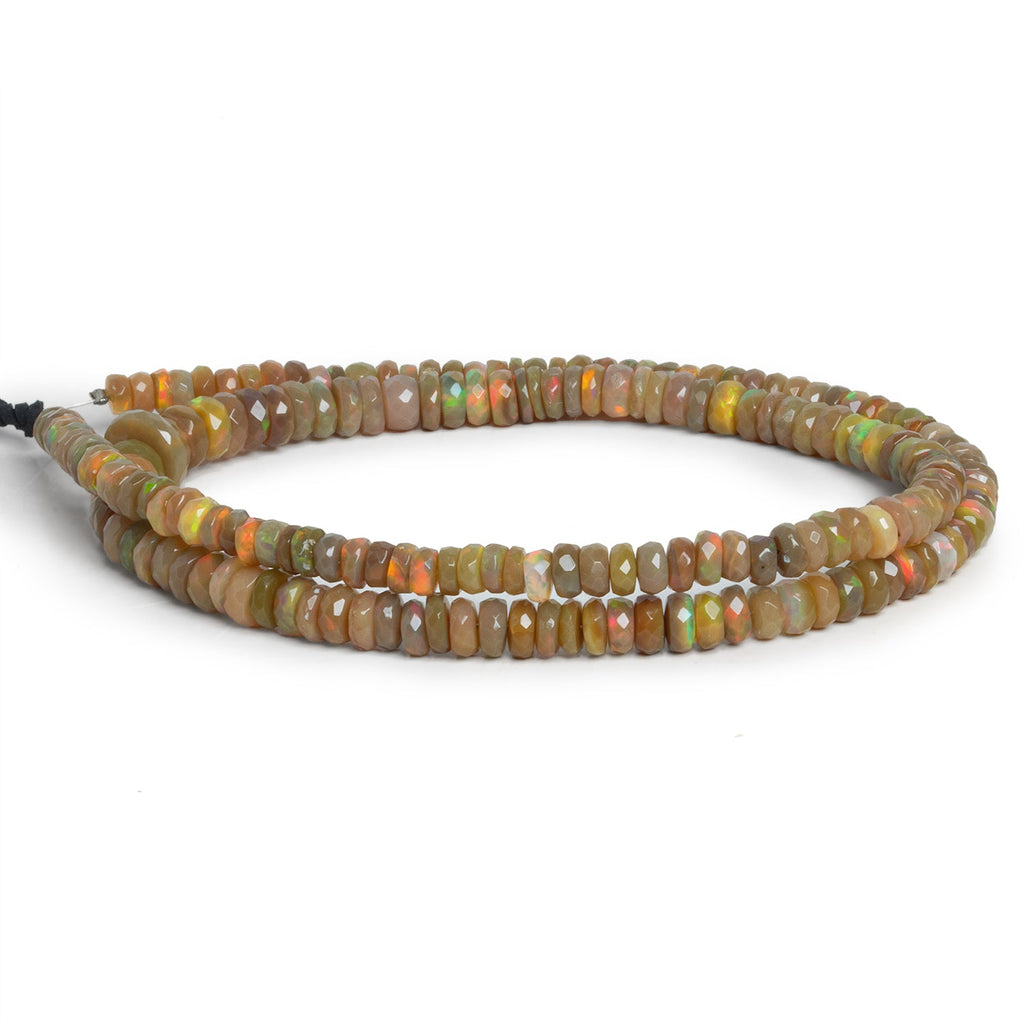 Beads measure about 4mm to 8mm in diameter. These exquisite beauties show off a milky, brownish-tan body brimming with flash in fiery reds, neon greens and alluring yellows. These high-quality opals have been curated on the strand to match in color and flash tone with exceptionally thin bodies similar to that of Heishi beads. Fans of this natural marvel of a stone will find unlimited possibilities for their Jewelry Designs, from necklaces to earrings and more!