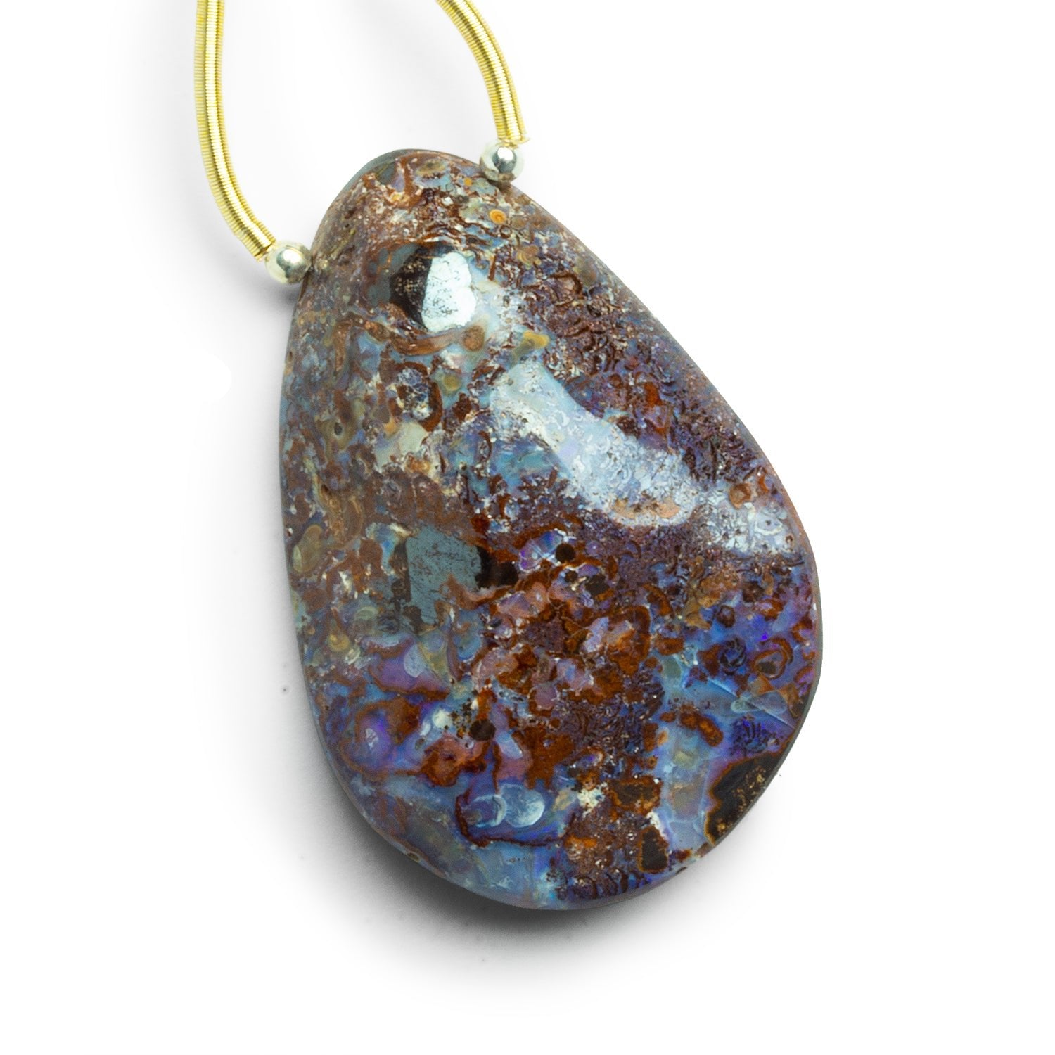 This 40x28mm Australian Boulder Opal Nugget Focal Bead is a mesmerizing collision of earth and fire. Its broad teardrop form is covered in a rugged matrix of ironstone, saturated with a chaotic display of opalized color—flashes of cobalt, lavender, indigo, and stormy gray dance across the surface like lightning through volcanic ash.