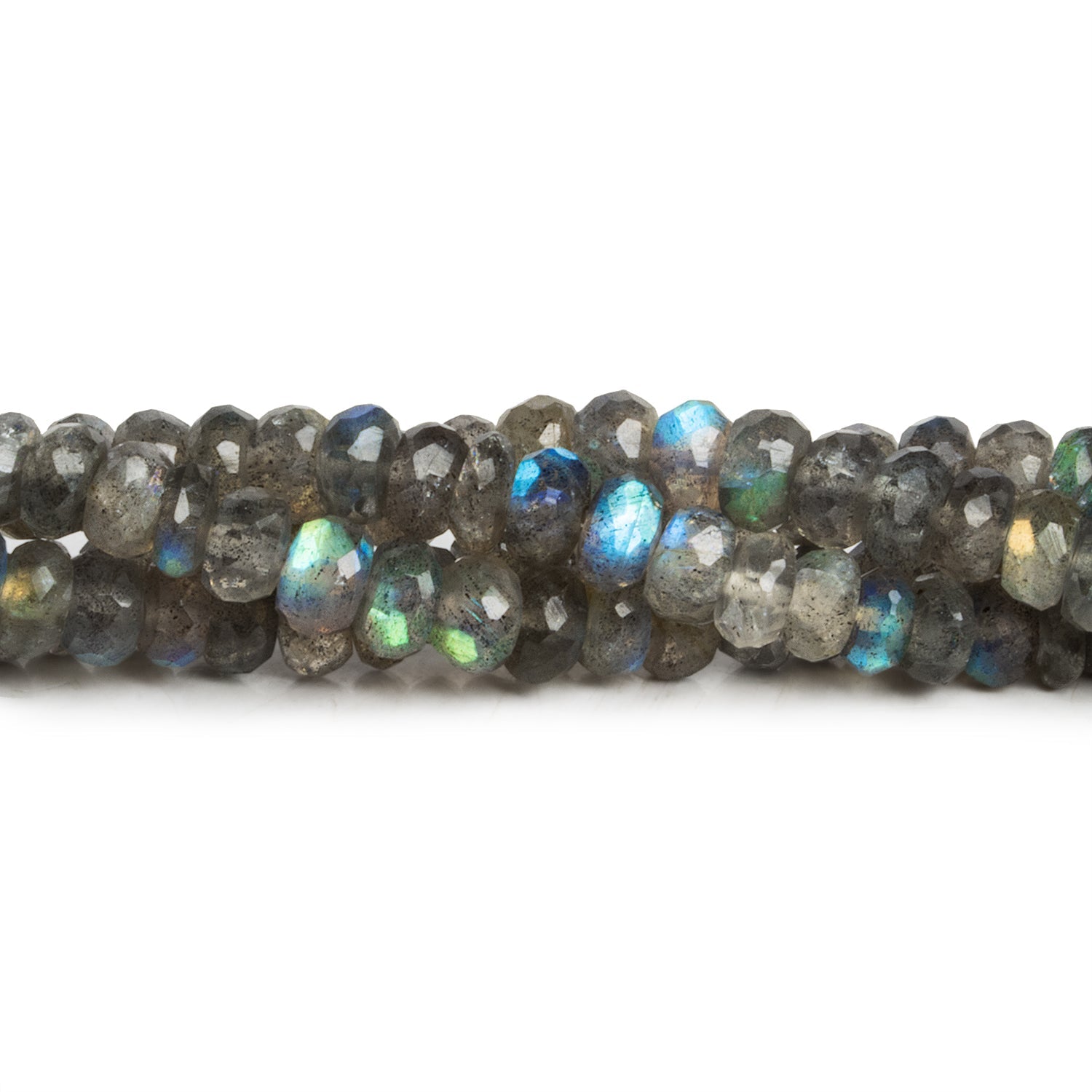Beads measure from about 5mm to 6mm in diameter. These beauties show off a wide ranging flash that brings electric blues, greens as well as reddish to yellow hues. With a moderate size and intriguing faceting, our rondelles are ideal for use as the mainstays of necklaces, earrings and bracelets and will play wonderfully with your favorite metal and gemstone pairings.