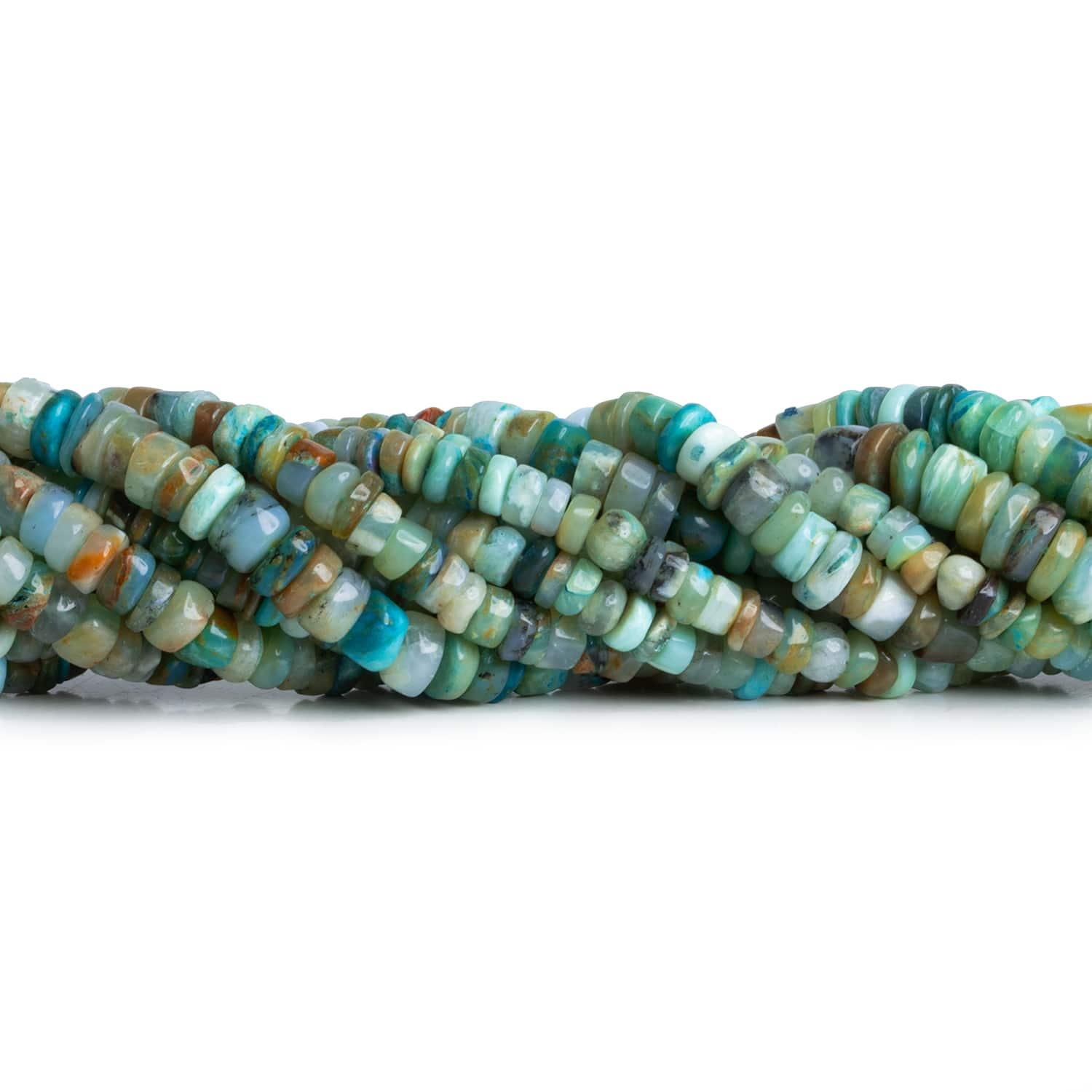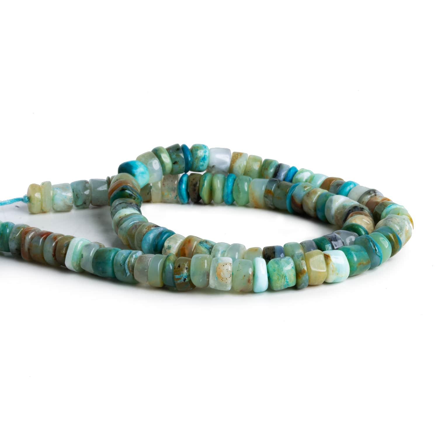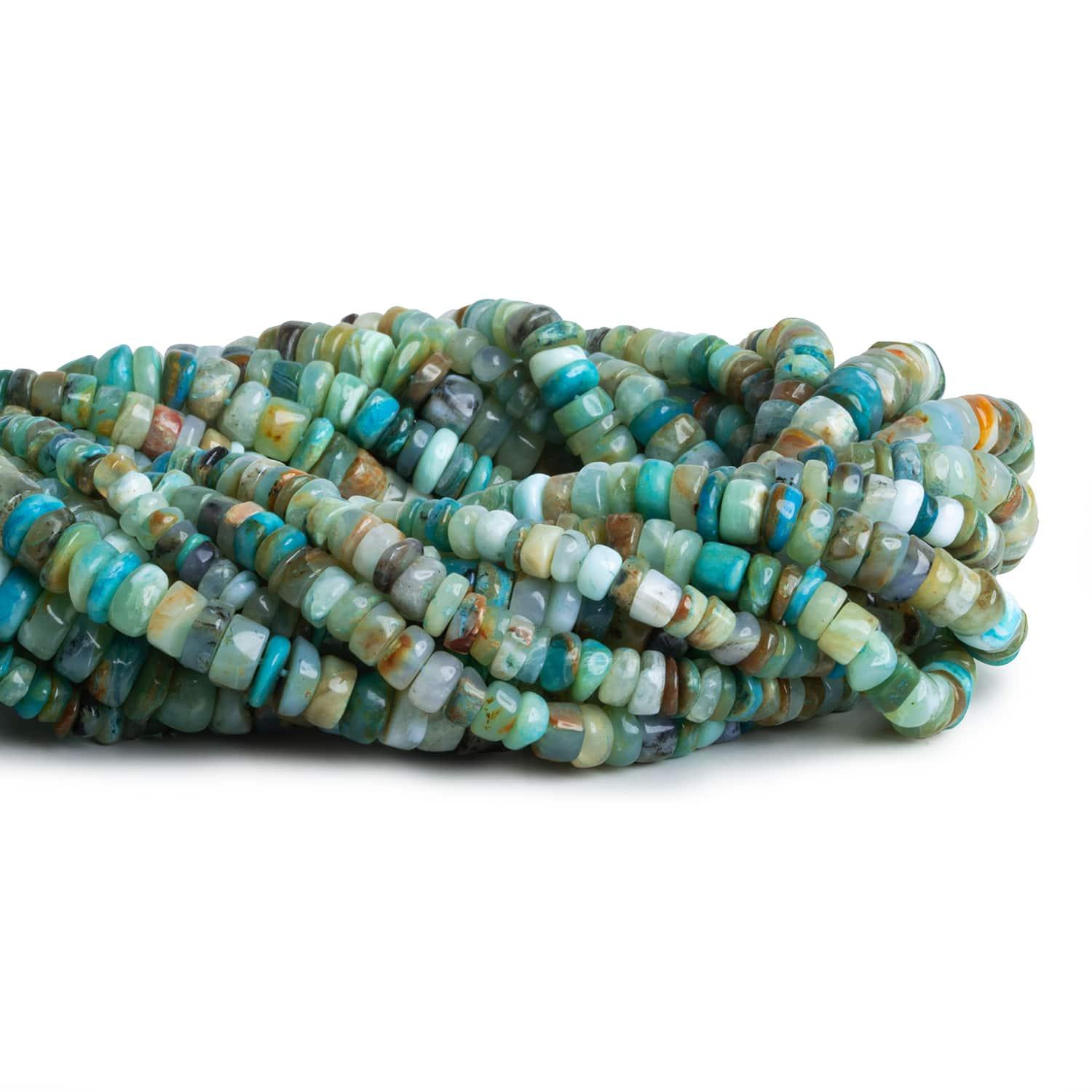 Beads range from about 5mm to 8mm in diameter. These curated strands feature a vibrant color palette of blues, greens, and earthy tones with a tire-like rondelle shape. Expect beads to vary in size and thickness significantly on and between strands. Fans of Blue Peruvian Opal should jump on these plain rondelles for their alluring appearance.