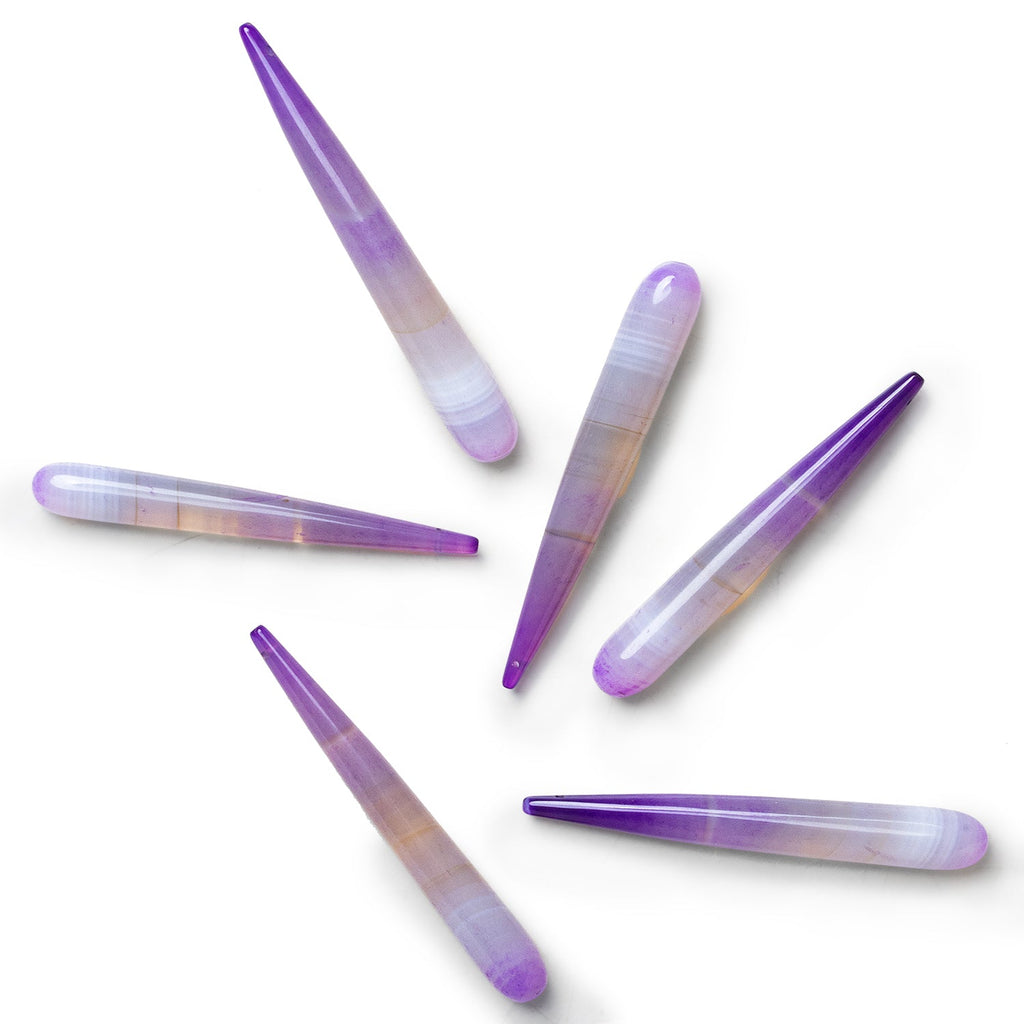 Beads range from about 52x6.5mm to 65x8mm. These sleek teardrops feature smooth polished bodies with a spectacular display of banding mingling rich purples through subtle greys and warm off-whites. Our curated, color-enhanced Chalcedony Teardrops are perfect for use as the focal point of eye-catching earrings, necklaces and more!