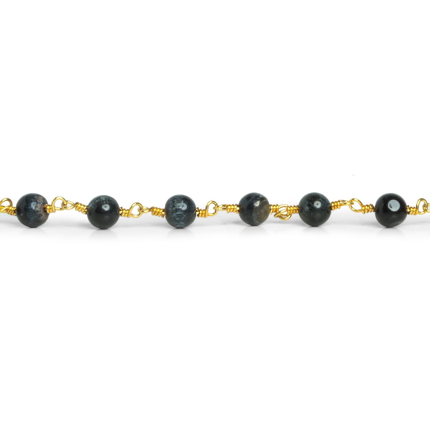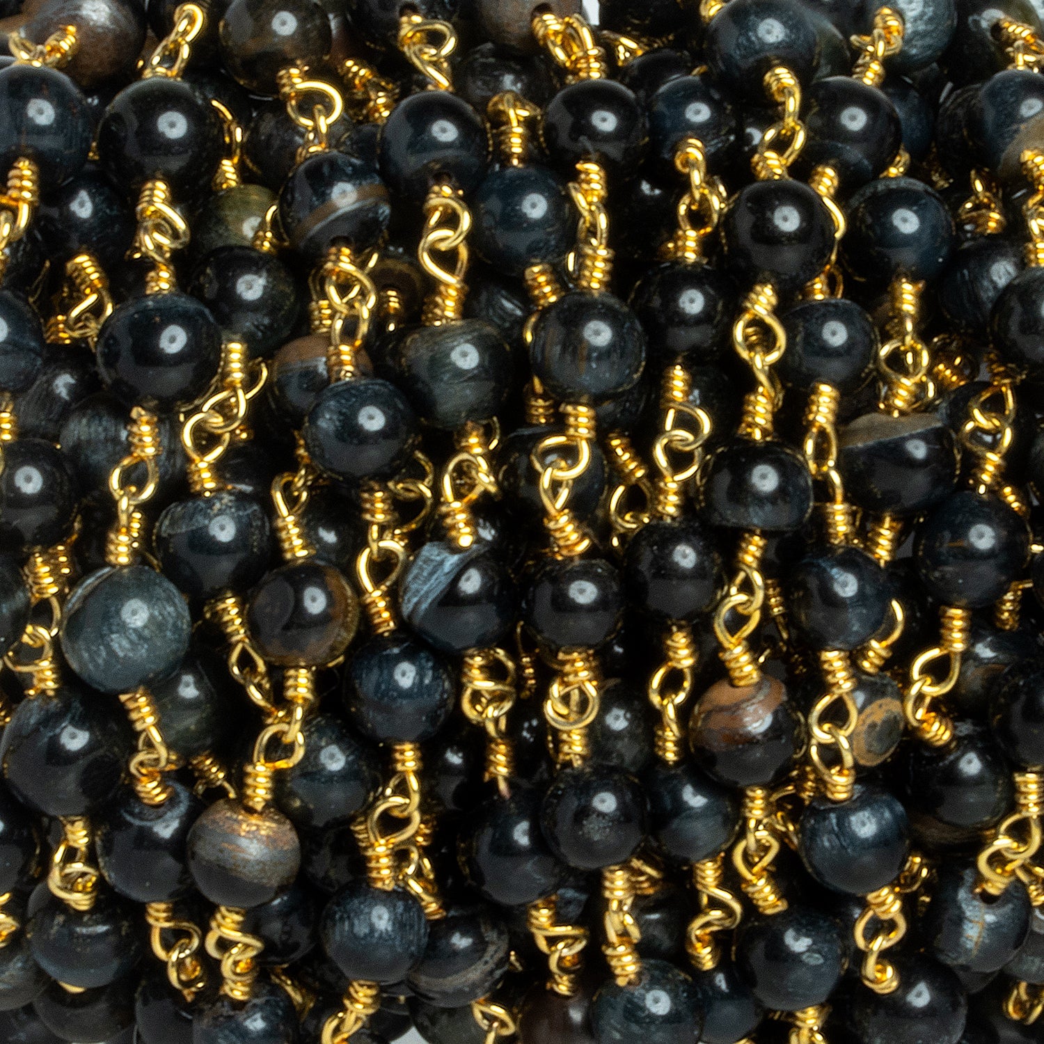 Beads are about 5mm in diameter with roughly 23 beads per foot of chain. These dark and mysterious Tiger's Eye pieces look amazing paired with our signature handwrapped gold plated chain. With their attention grabbing cat's eye effect, these beauties imbue a classic mystique perfect for necklaces, bracelets, earrings or wherever your designs take you!