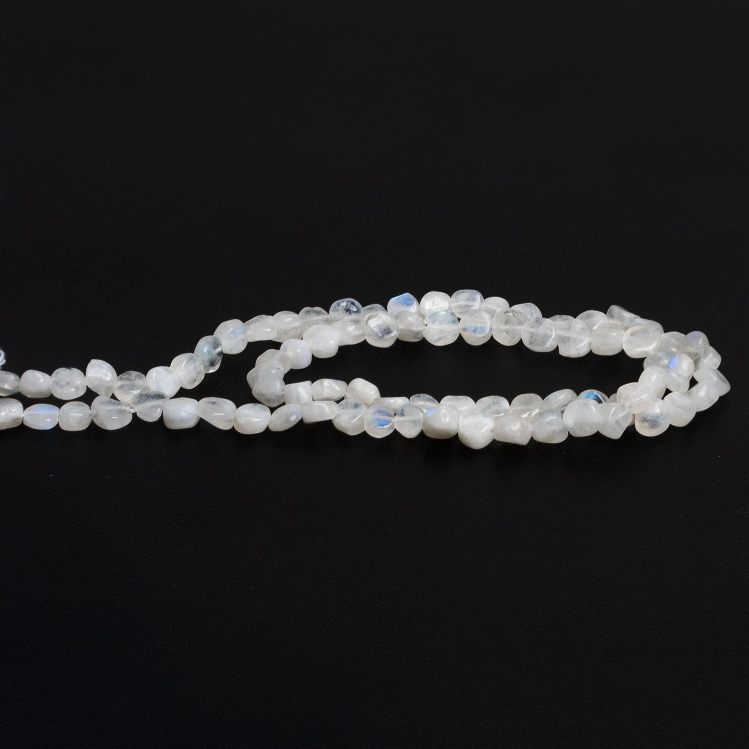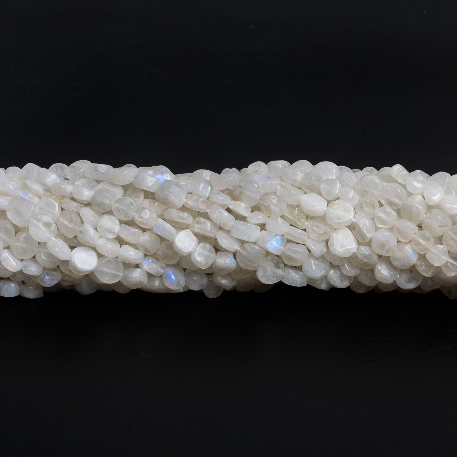 Beads measure about 5mm in diameter. These dainty little Rainbow Moonstone coins show off an excellent display of vibrant blue flash on handcut shapes that impart an organic, naturalistic appeal. Fans of the gemstone will note a milky, closer to opaque clarity on beads whose size varies a mm or so on the strand.
