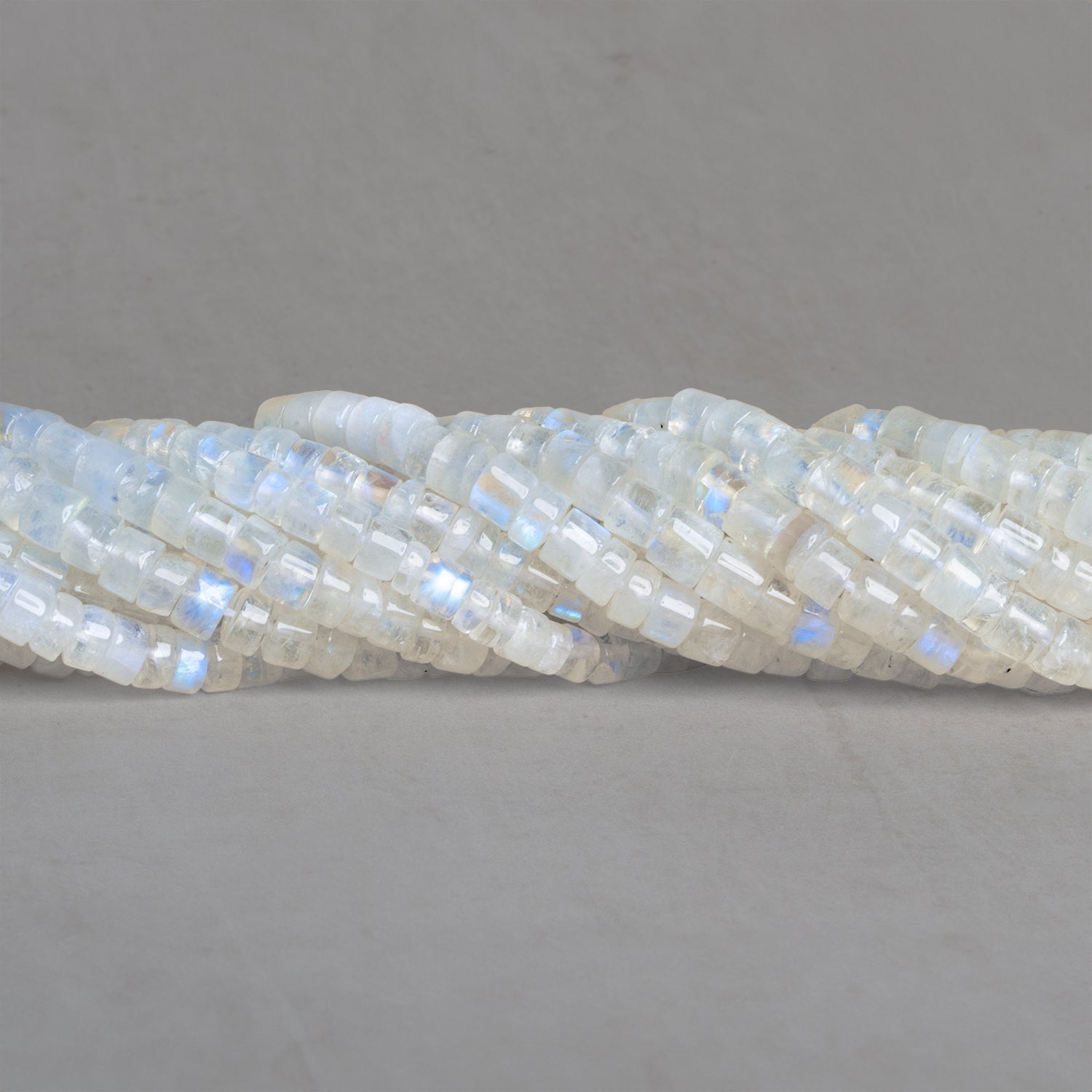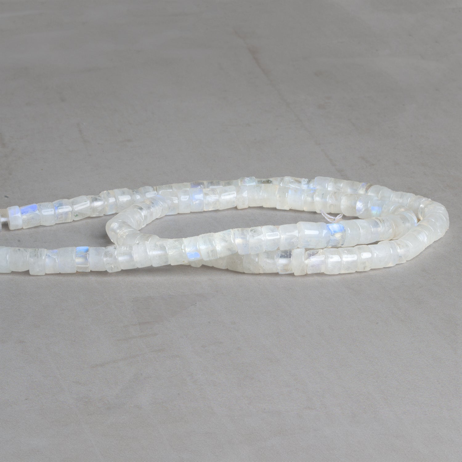 Beads average about 5mm in diameter. These heishis have a relatively longer body similar to a short tube shape, with beautiful blue tone flash emanating throughout the strand. Expect a milky to cloudy clarity and a high consistency in size. These sleek shapes make for the perfect vehicle to show off your flashy Rainbow Moonstone accessories, perfect for use in necklaces, bracelets, earrings and more.
