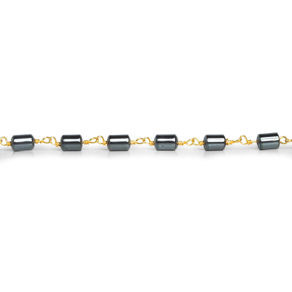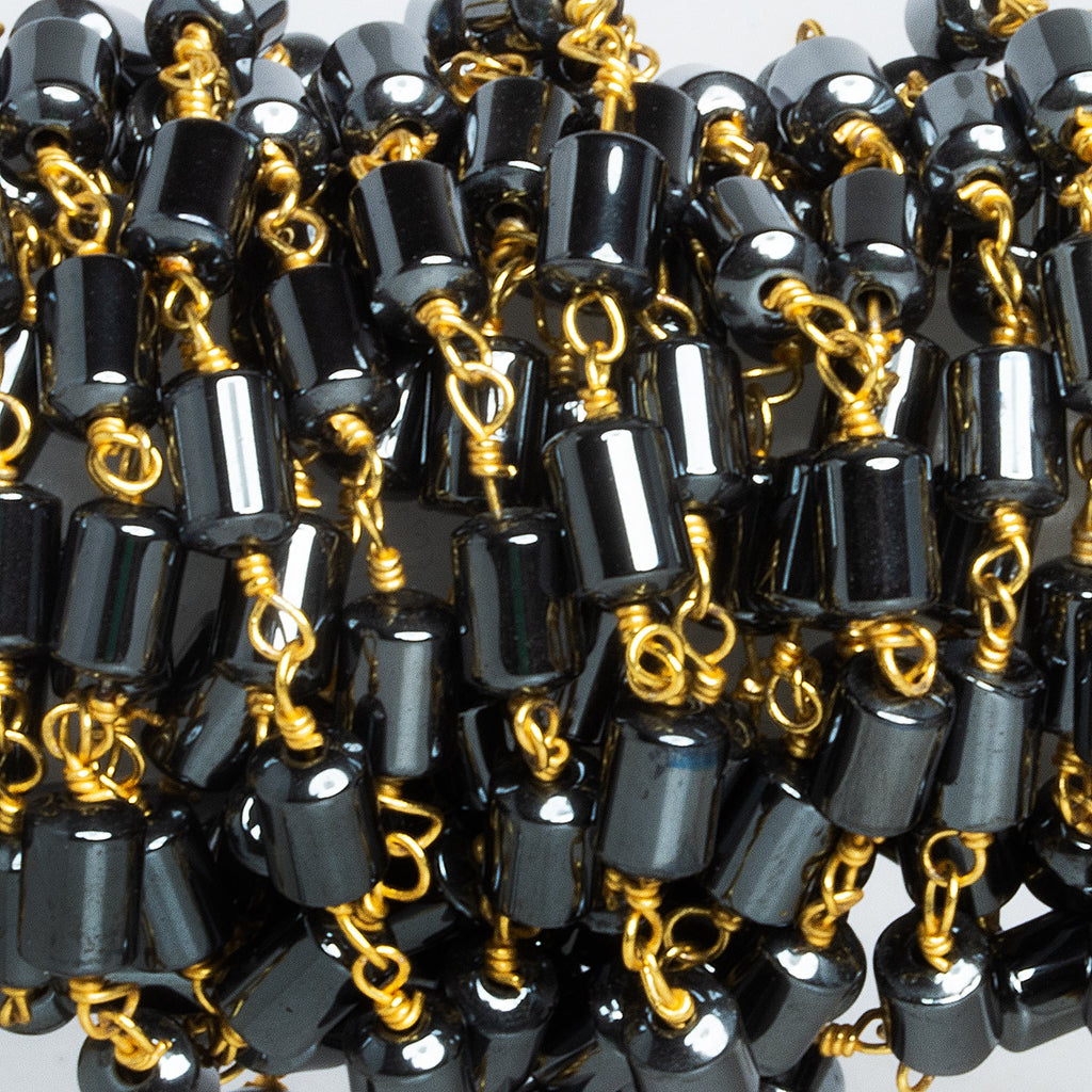 Beads measure about 5x4mm with about 28 beads per foot of chain. Our Hematite Tubes feature a smooth metallic polish that looks amazing paired with our gold plated handwrapped chain. Fans looking for an eye-catching chain offering in Hematite will love this special design, perfect for elegant necklaces, earrings and more!