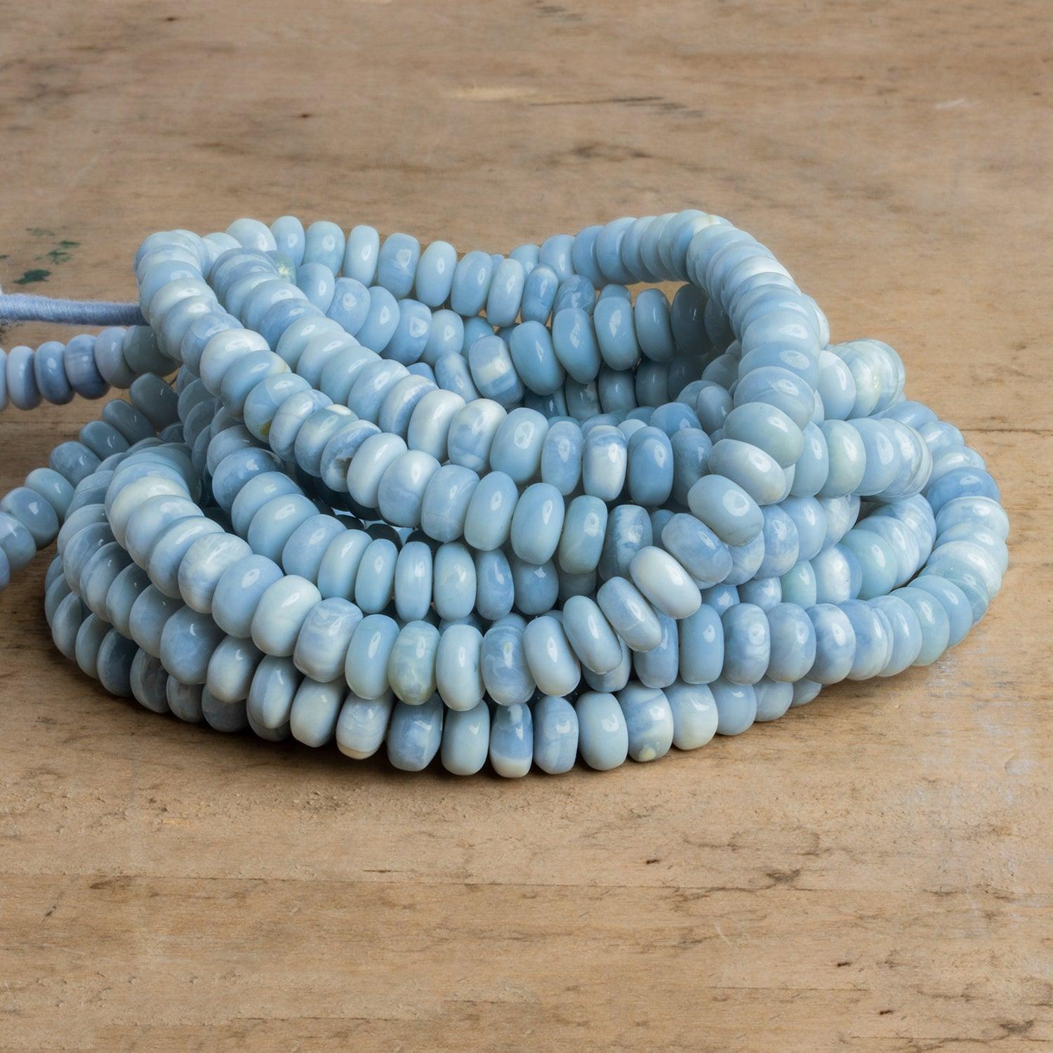 Beads measure 6mm to 8mm in diameter with little to no variation. These smooth polished beauties show off a tire-like shape with the light-blue color palette familiar to fans of Denim Blue Opal. Drill holes measure 0.7mm with applications in some large hole media. Also known as "Owyhee Opal".