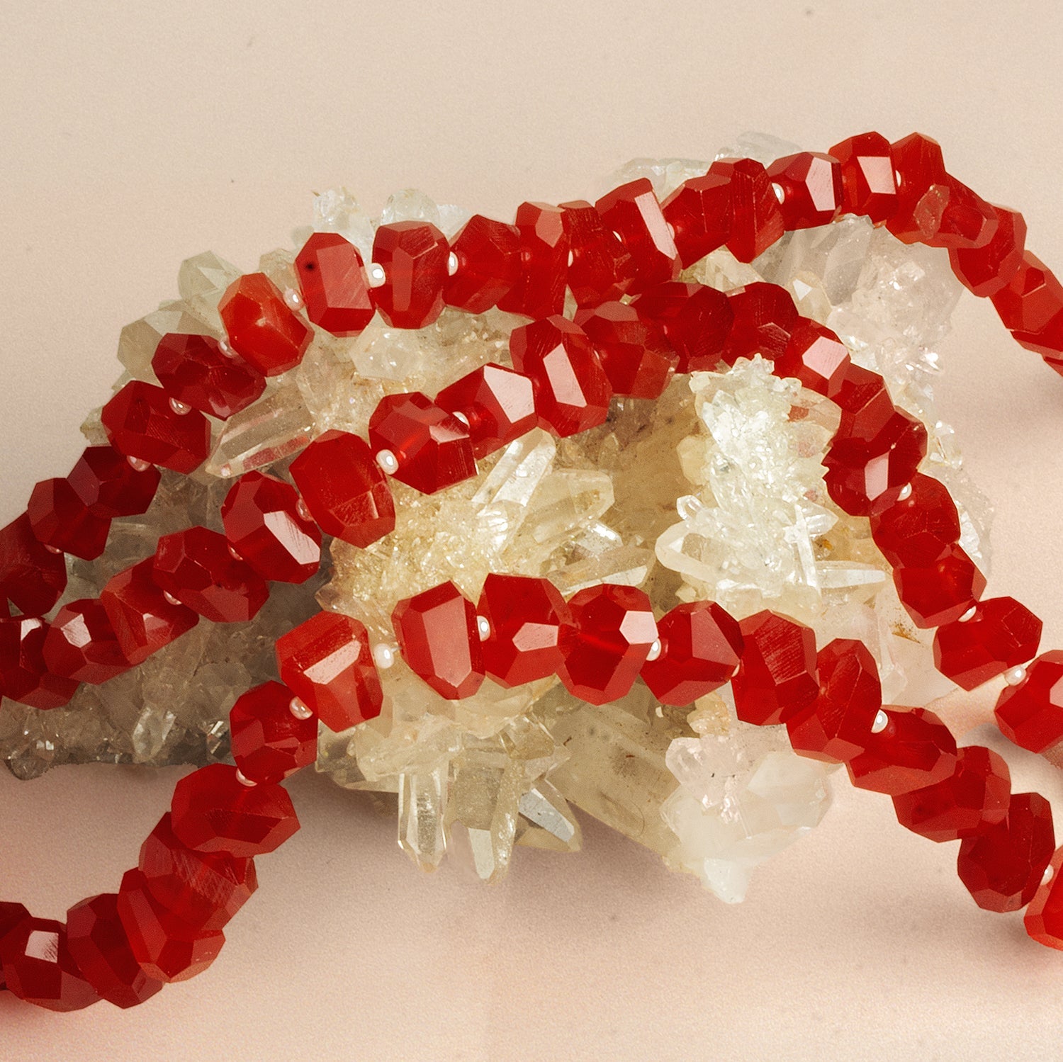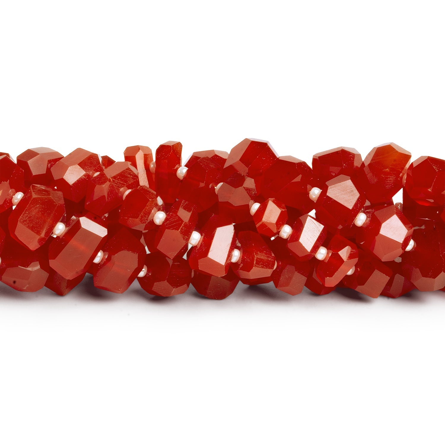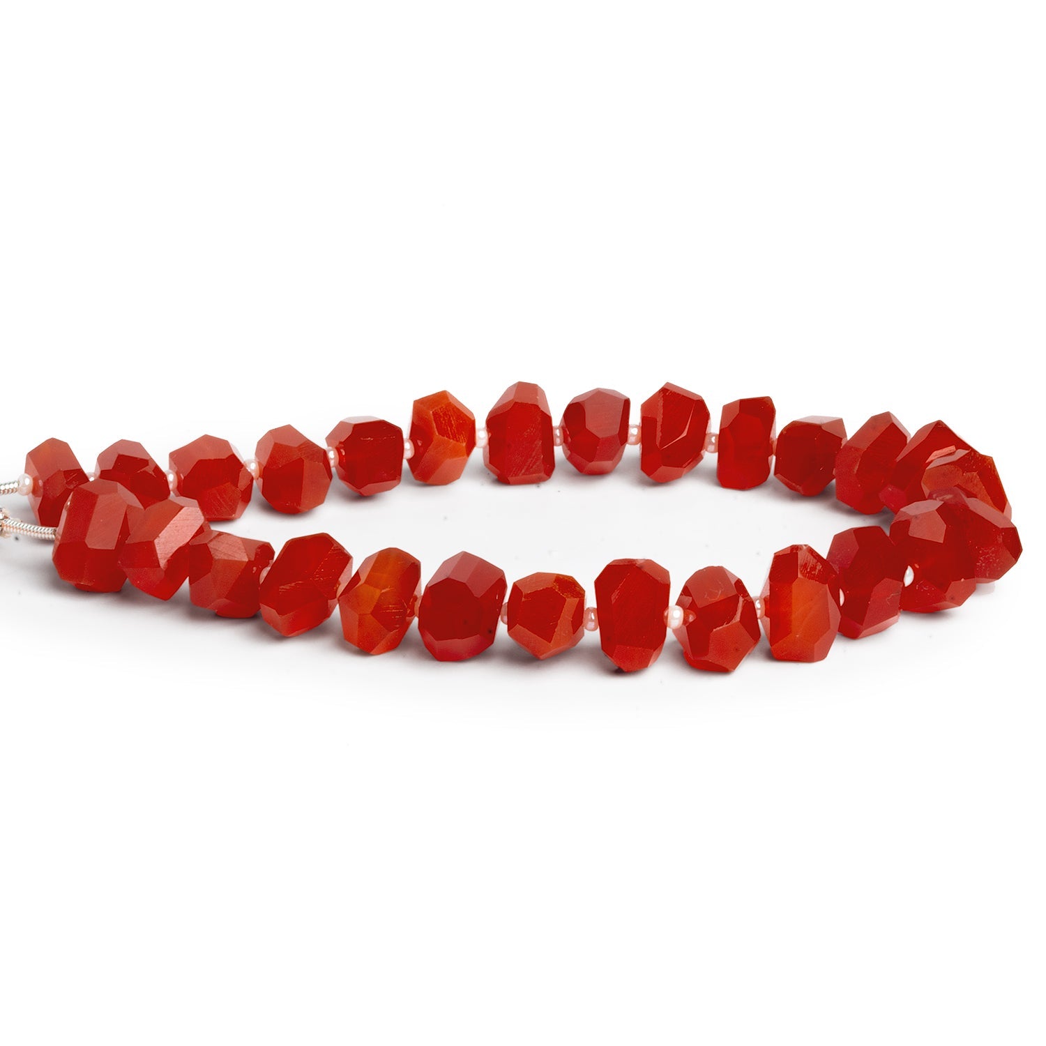 Our Carnelian Faceted Nugget Beads radiate a deep, smoldering red with subtle orange undertones—each bead masterfully faceted to bring out the gem’s natural glow. Measuring between 7mm and 11mm, these nuggets are expertly cut with crisp geometric planes that capture and reflect light, giving them a bold, dimensional sparkle.