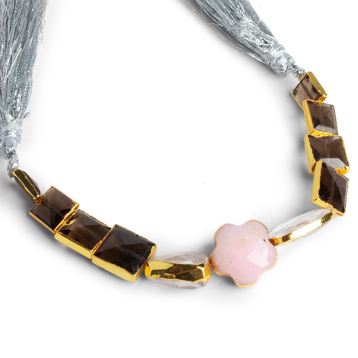 These Gold Leafed Multi Gemstone Beads combine contemporary elegance with artisanal detail, making them perfect for statement jewelry creations. The strand features striking smoky quartz in crisp geometric cuts, soft pink oval carved into a delicate flower, and luminous faceted white and champagne-toned gemstones. Each bead is framed in a radiant layer of gold leaf, adding a warm metallic glow that highlights the natural beauty of the stones.