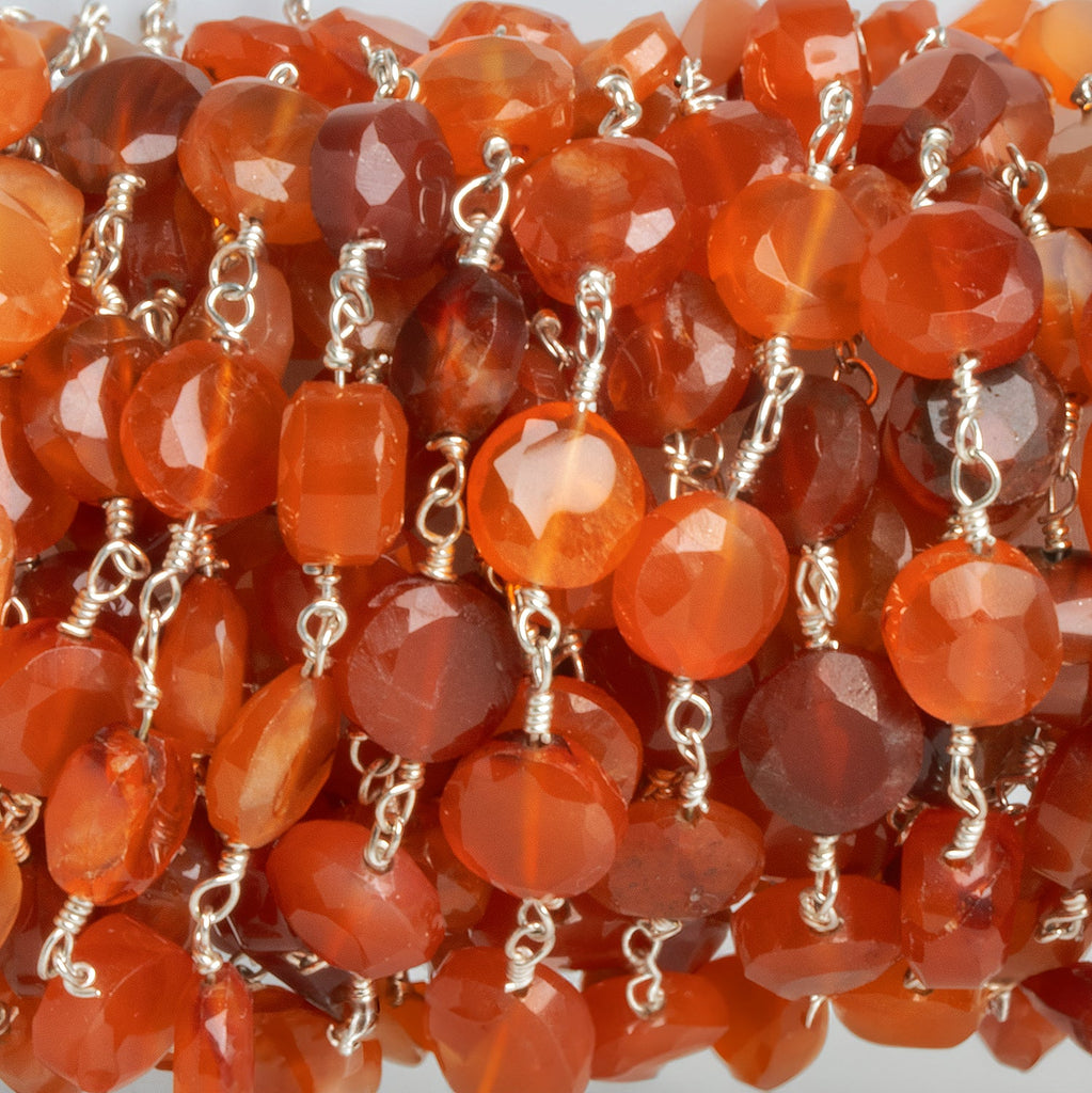 Beads average 7mm. Chain has about 23 beads per foot. Expect a Carnelian color palette ranging from light orange to dark red.