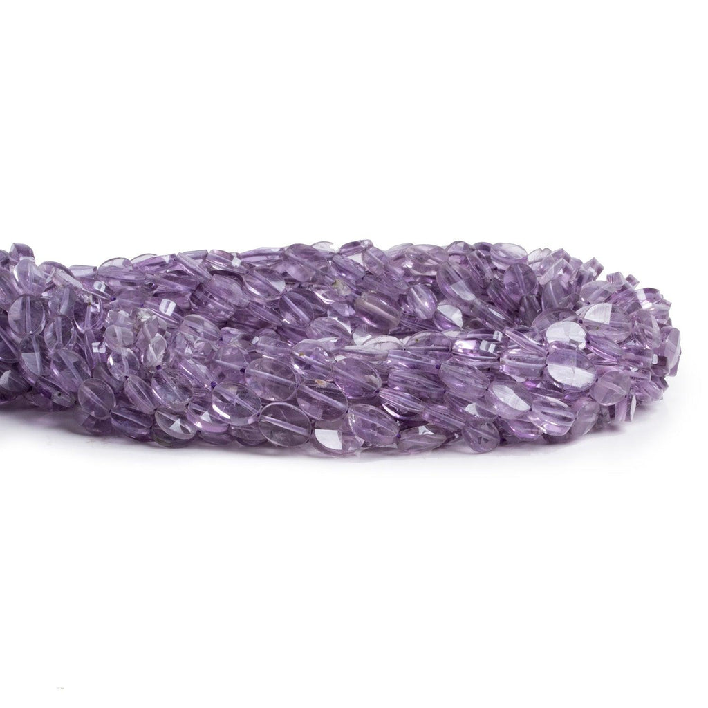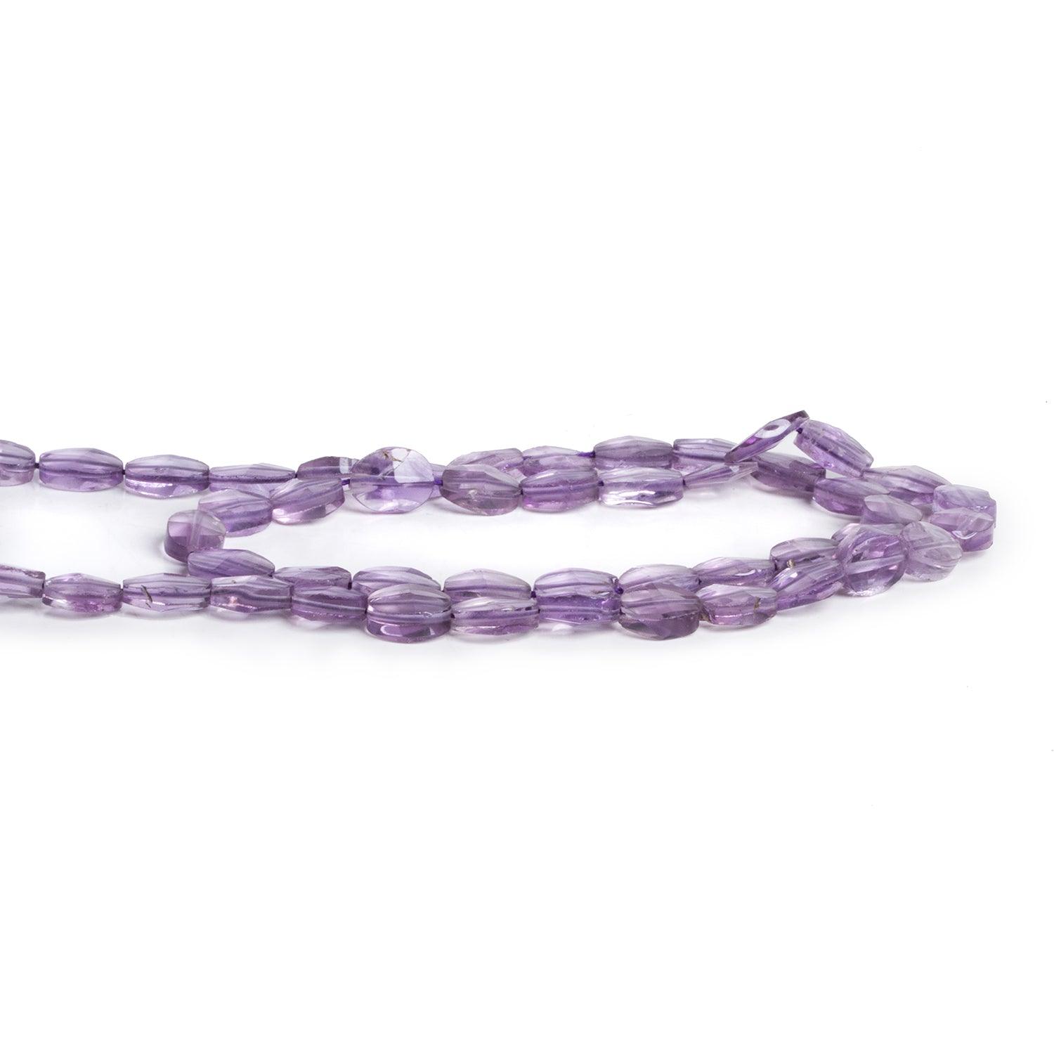 Beads measure 6x4mm to 7x5mm. These unique pieces show off a sleek faceting on clear, light-colored bodies. Expect a soft Amethyst hue that is highly consistent across the strand. These pieces have a smooth polished, rounded edge.