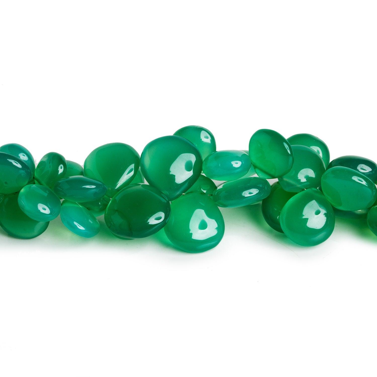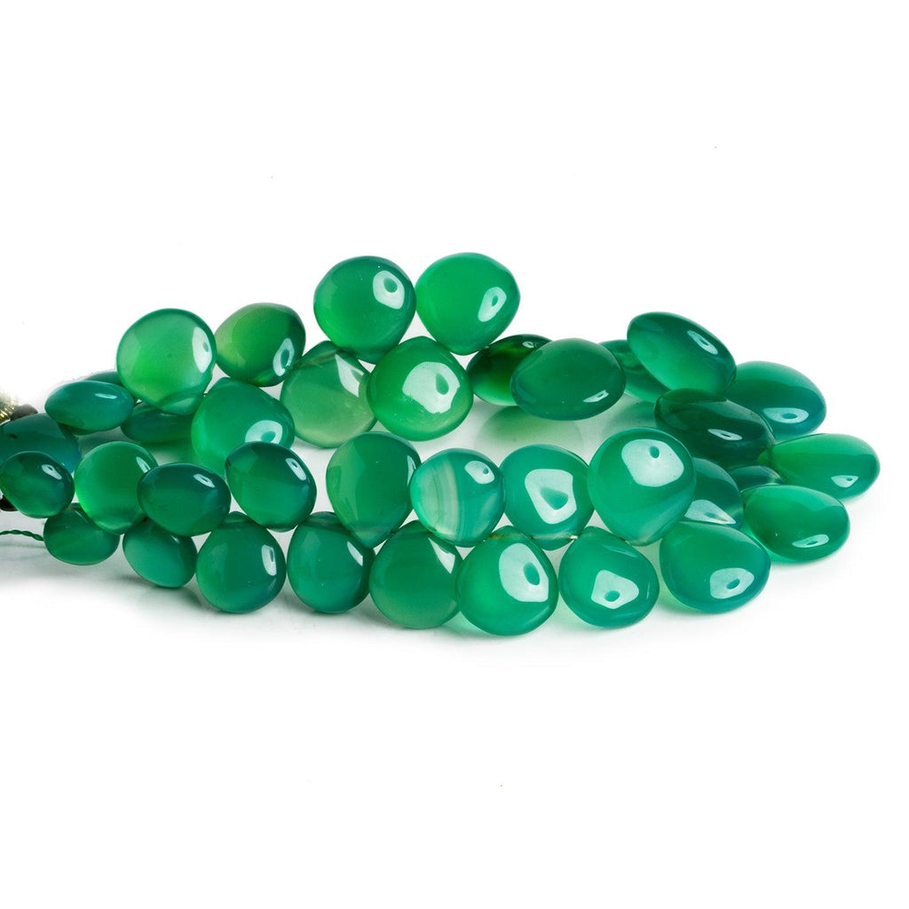 Beads measure about 8mm to 13mm in diameter. These beads have a vibrant green coloration that is generally consistent across the strand.