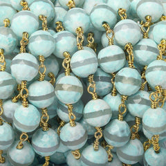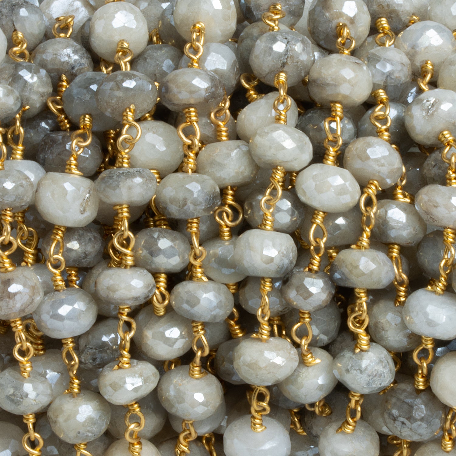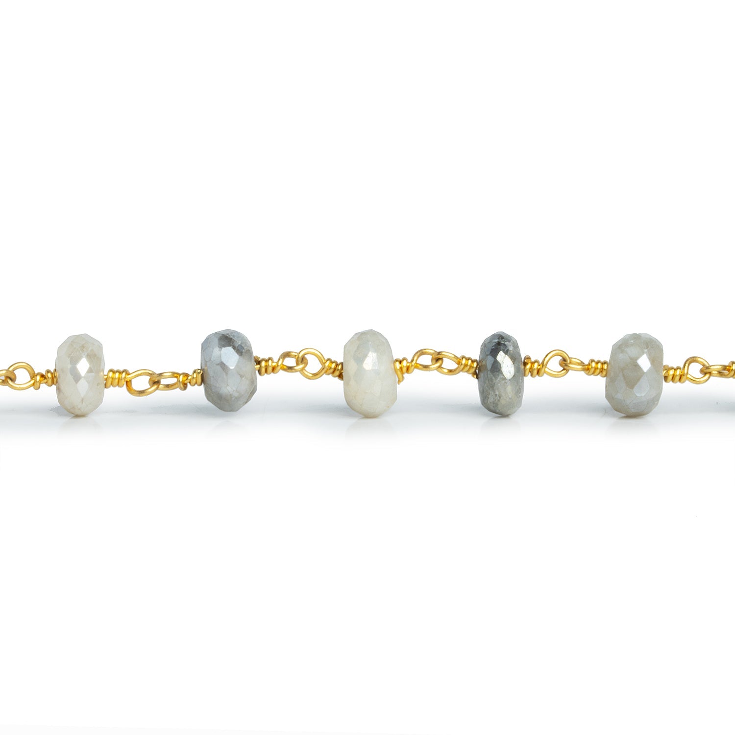 Beads average 8mm to 9mm in diameter. Chain has about 23 beads per foot. Expect a white and grey color palette that dazzles in our signature mystic coating and gold plated chain.