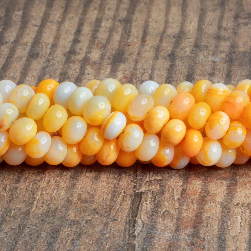 These beads average 8mm to 9mm in diameter with a 0.5mm drill hole. These strands feature a vibrant yellowish-orange color palette that has to be seen to be believed. Expect some eye-catching patterns & textures on these unique, curated strands perfect for a wide range of jewelry designs.